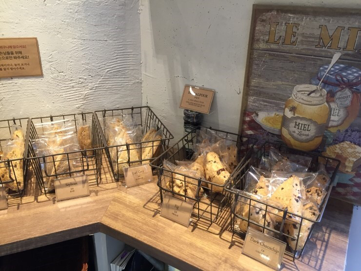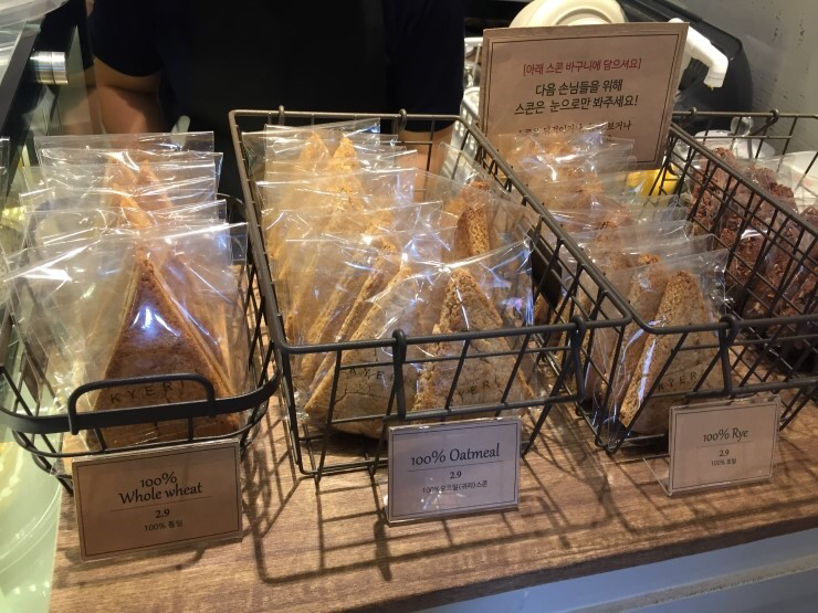 케이크를 고르고 나면 2차 번뇌가 시작된다. 냉장고 옆에 위치한 약 10여 종의 스콘들이 손짓하기 때문이다. 통밀100, 호밀 100, 귀리 100은 건강식 마니아들에게 인기가 좋고 무화과 스콘이나 초코칩 스콘 등은 부재료가 들어 좀 더 대중적이며, 자색 고구마, 쑥, 콩 등 한국적인 식재료를 이용한 스콘도 매력적이다.