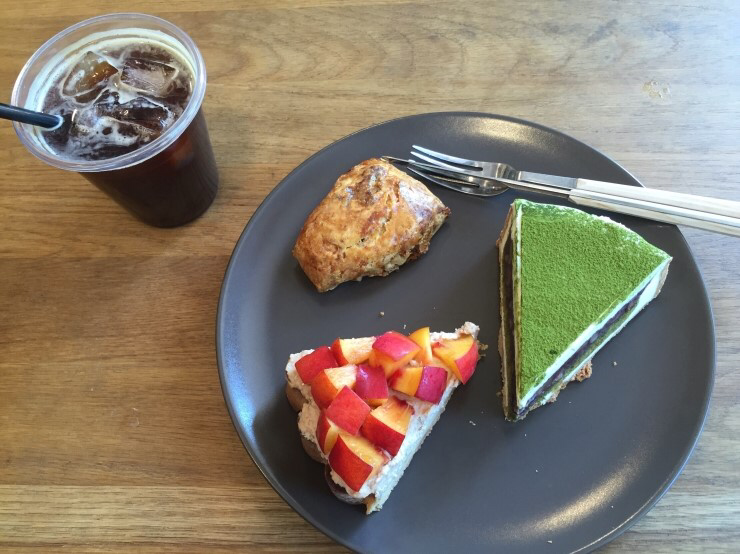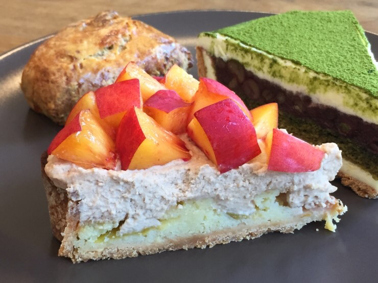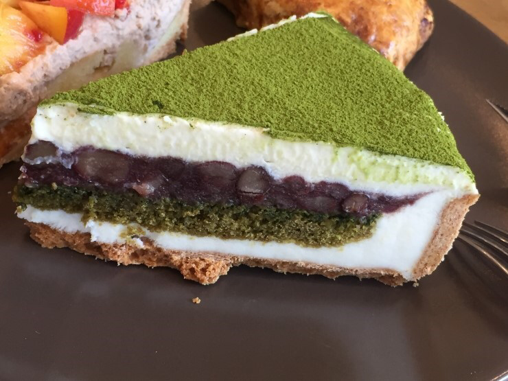 상상이상으로 향긋한 천도복숭아와 부드러운 크림, 쿠키 같은 타르트지와 고소한 아몬드 크림도 좋고 사이사이 들어있는 자두가 상큼한 포인트였다. 그야말로 여름을 붙잡아 둔 청량한 타르트. 사라지는 게 아쉬워 녹차 단팥 티라미수도 맛본다.