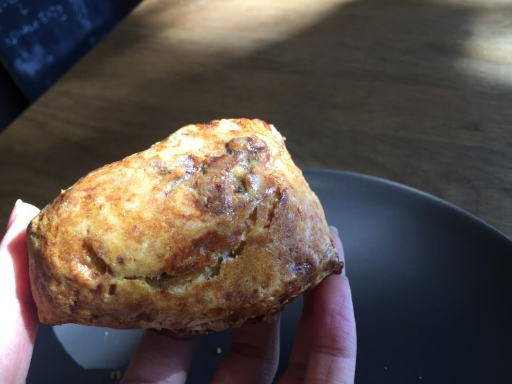 조금 달겠거니 싶었는데 생각만큼 달지는 않았다. 탄탄해서 신기했던 말차 시트와 알알이 살아있는 통팥 앙금, 부드러운 마스카포네 치즈크림, 그리고 쌉싸름한 녹차 가루. 생각만큼 녹차 맛이 진하진 않았는데 한데 어우러지는 느낌이 참 좋았다. 중간중간 짭짤함도 느껴지는 단짠 법칙에 충실한 티라미수 타르트였다. 마지막은 묵직한 무게와 존재감을 뽐내는 호두가 인상적인 곶감대추스콘. 그간 먹어 본 프레이야의 디저트들이 꽤나 달았기에 스콘도 달 거라 예상했는데, 단 맛이 거의 느껴지지 않는 담백한 스콘이었다. 곶감의 은은한 단맛이 전부인 깔끔한 스콘.