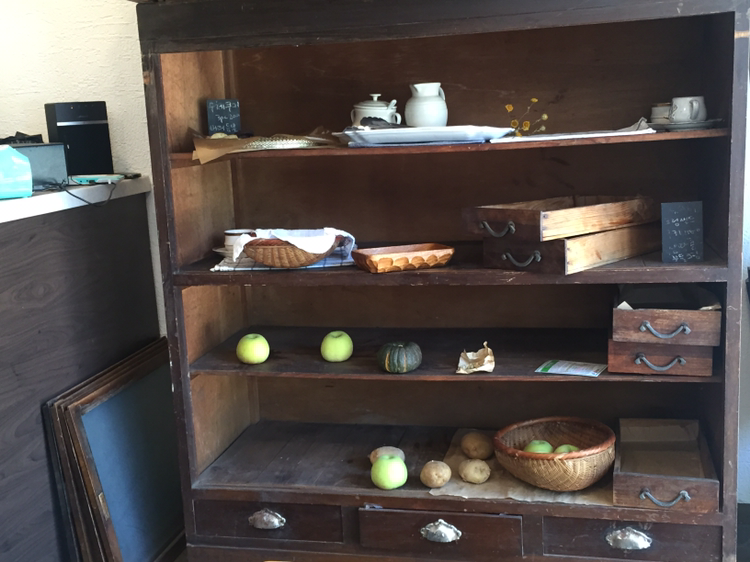 배가 차니 그제야 주변이 눈에 들어온다. 정면에 있는 서랍장엔 매번 제철 맞은 과일과 채소가 가득했었는데, 이 날은 아오리 사과 몇 개와 감자 몇 알, 단호박 한 통이 전부다. 그나마 있던 미니 단호박은 다음날 디저트로 탄생할 예정인지 쉐프님과 함께 주방으로 사라졌다.