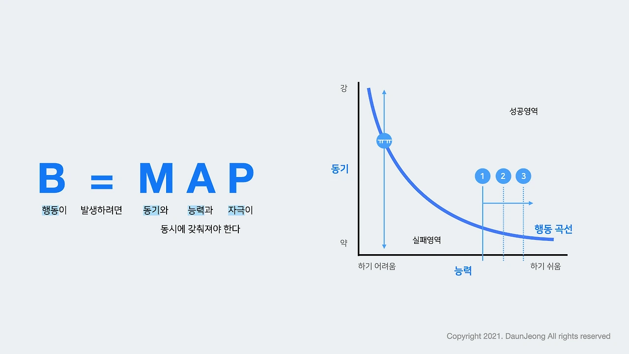 포그의 행동모델에 따르면 행동(Behavior)은 동기(Motivation), 실행할 수 있는 능력(Ability), 자극 (Prompt)이 동시에 필요하다고 한다. 습관을 만들고 싶다면 이 3가지 요인을 잘 설계해야 하는데 3가지 요인중 가장 먼저 생각할 것이 바로 '능력'이다.
