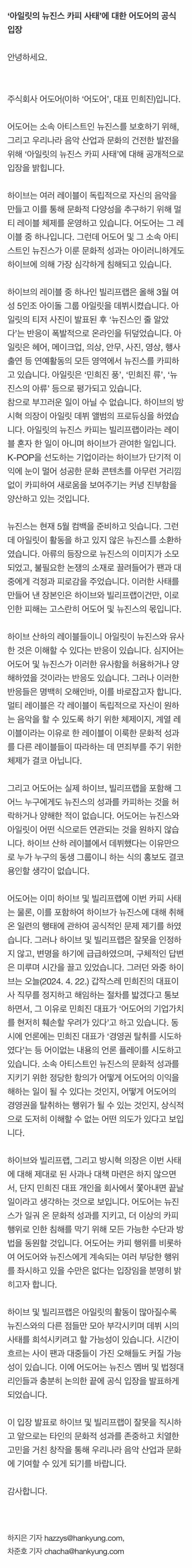 먼저 입장문의 제목부터 잘못되었다. 하이브가 민희진 대표에게 요구한 질의 내용은 모두가 알다시피 제목에 적혀있는 ['아일릿의 뉴진스 카피 사태'에 대한 어도어의 공식 입장]이 아니다. 물론 입장문에 (하이브가) 어이없는 내용의 언론플레이를 시도하고 있다며 세간에 알려진 내용을 부인하긴 했지만, 대부분의 내용은 '아일릿이 뉴진스를 카피했다'는 내용이다.