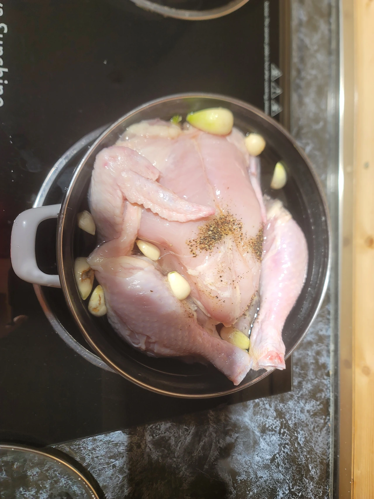 우리에겐 너무 짠 조지아 음식을 견디지 못하고 삶은 냉동 닭.