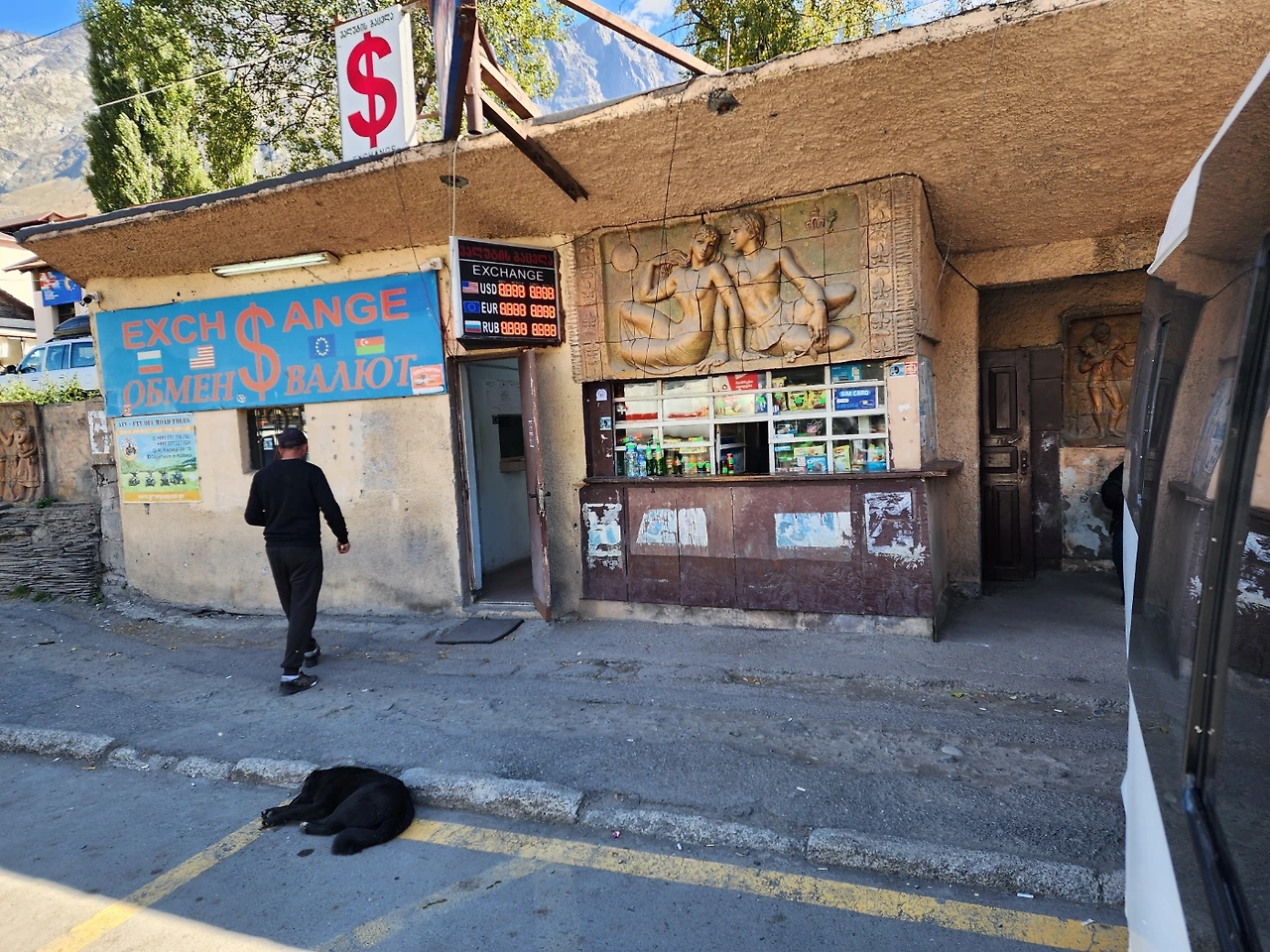 카즈베기에서 트빌리시로 가는 마슈로카에 탔다. (승합차보다는 조금 큰 미니 밴, 조지아 지역 간 이동 버스라고 보면 된다. 아래 사진이 카즈베기 마슈로카 탑승 장소이다. 카즈베기 센터 SPAR슈퍼 옆쪽에 있다. 작은 장소라 쉽게 지나칠 수 있지만, 마슈로카를 타기 위한 사람들로 붐비는 곳이니 쉽게 발견할 수 있을 것이다. 인당 15라리, 캐리어 하나에 5라리 추가.)