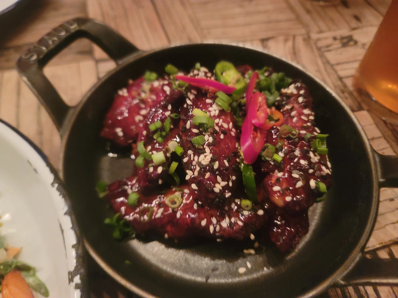 굳이 설명하자면 쭉쭉 늘어나는 인절미나 치즈와 함께 새콤한 잼을 묻힌 쌈무에 싸 먹는 돼지 수육이랄까.