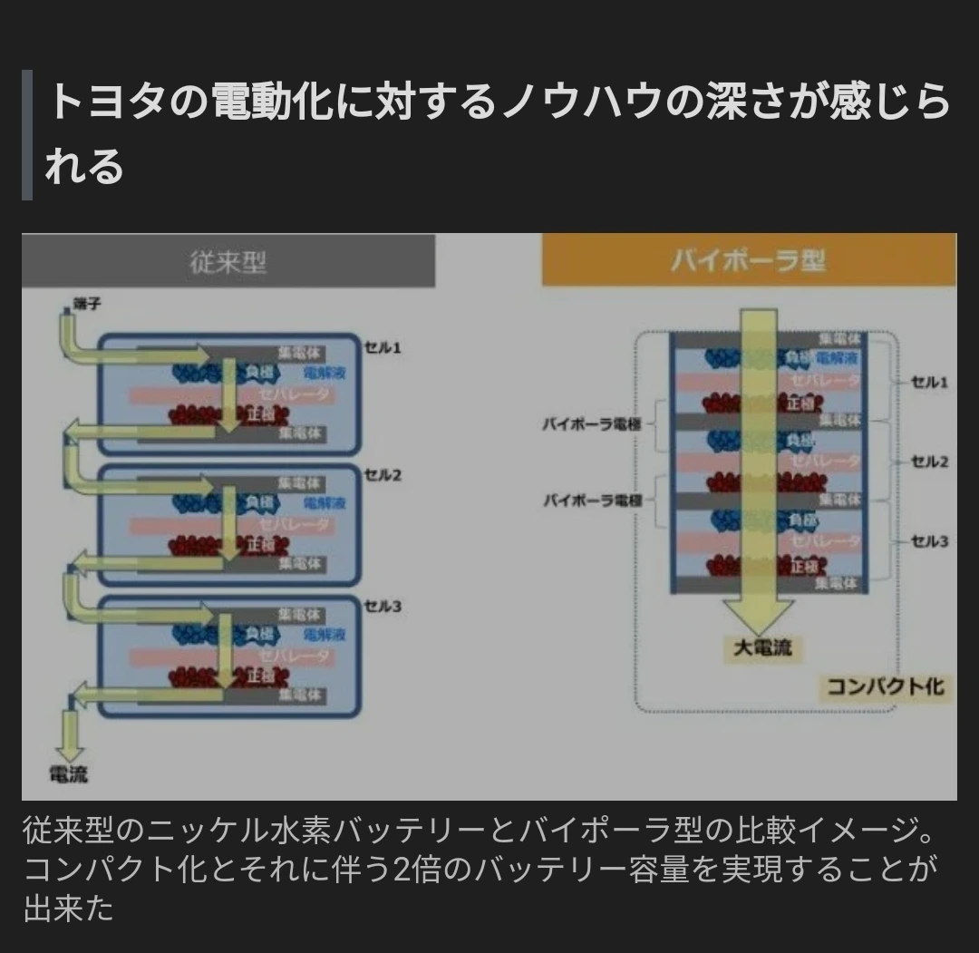 이번에 도요타가 새로 개발해서 장착한 바이폴라 니켈수소는 안전하면서 종래 배터리 대비 출력을 2배 올렸다.