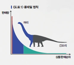 ‘롱테일 법칙’이라는 것이 있다. 2004년 크리스 앤더슨에 의해 처음 소개된 용어로, 판매량이 높은 제품 순서대로 배치하면 오른쪽으로 갈수록 길게 늘어진 곡선이 마치 꼬리가 긴 공룡 모습과 비슷하다고 해서 붙여진 이름이다. (<도표 1> 참조)