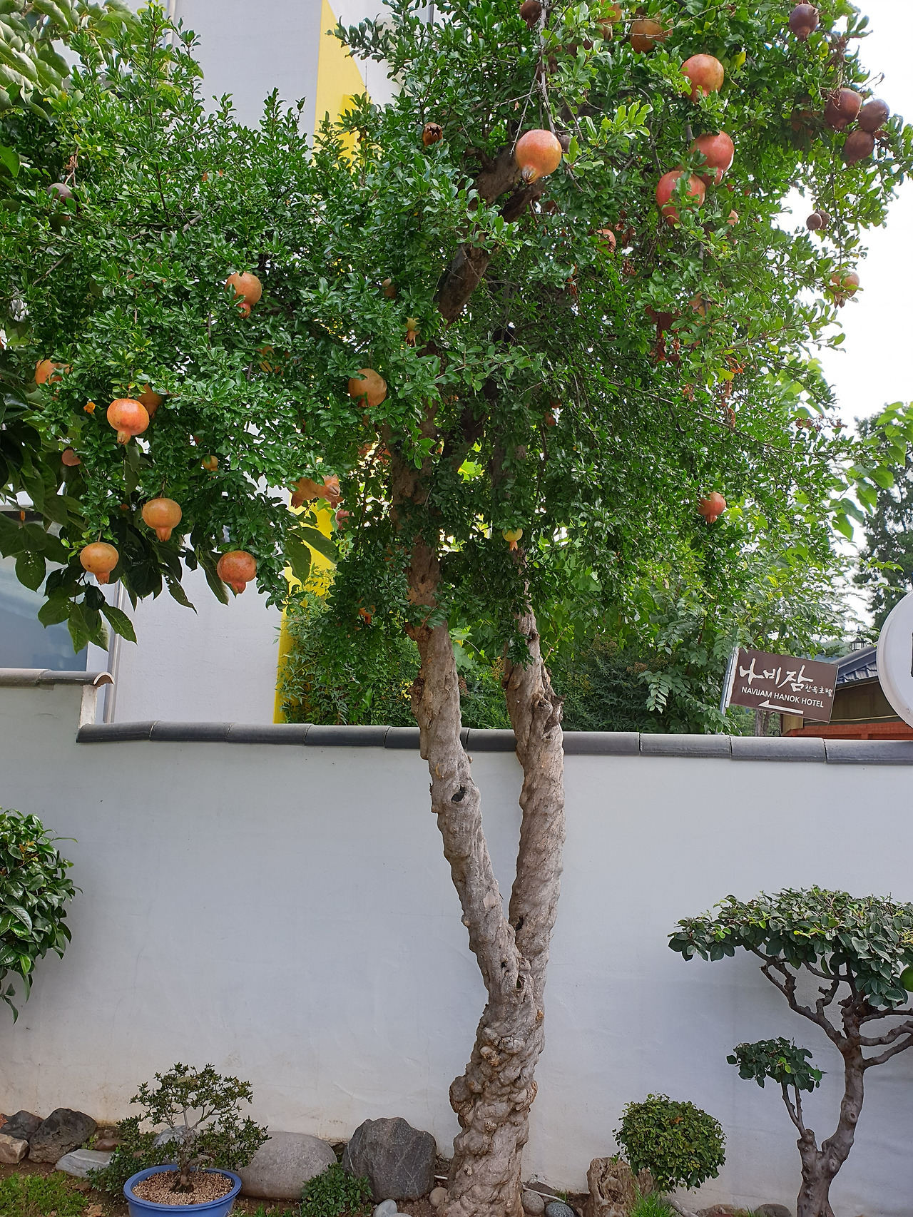 모과나무와 함께 눈길을 끄는 것은 석류다. 나무 문짝으로 만들어진 대문 바로 곁에 있는 석류나무도 모과나무 못지않은 연륜을 보인다. 한국에서는 이렇게 굵은 둥치를 지닌 석류나무를 본 적이 없는 것 같다. 아담한 나무의 잎새 사이사이에 이미 붉어진 열매들이 쉽게 눈에 띈다. 화분에 심어진 석류만을 보던 내게는 신기하기만 하다. 언젠가 터키의 이스탄불에서 우리 돈 천 원쯤에 석류 주스를 사서 아내와 함께 마신 적이 있었다. 길 주변 상점에 수북이 쌓인 내 주먹보다 큰 붉은 석류 열매가 경이롭던 기억처럼 한옥의 석류나무도 내게는 놀라웠다.