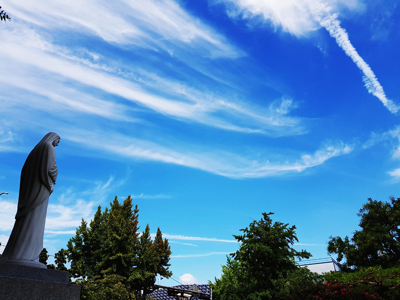 성당을 한 바퀴 돌아보았다. 뒤편에는 성모 마리아 상이 입구 쪽에는 예수님상이 자리하고 있었다. 가을 하늘과 구름을 배경으로 한, 흰색 석상들이 잘 어울린다. 오 교수와 나는 연이어 사진을 찍었다. 그리고 성당 옆에 붉은색 꽃을 풍성히 달고 있는 배롱나무도 한 컷 담았다. 먼지 없고 티끌도 보이지 않는 짙푸른 하늘에 마치 수채화 붓으로 그린 듯 가녀린 흰 구름, ‘가을이 왔다.’ 나는 혼잣말을 하고 있었다.