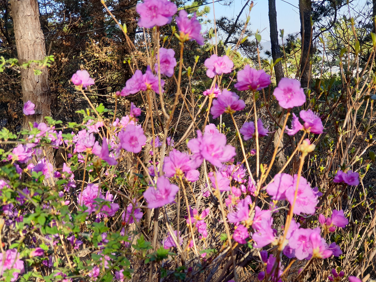 일요일, 다가오는 봄의 실체를 확인하고 싶었다. 작은 능선의 내리막길에도 진달래 한 무리가 피어나고 있다. 휴대전화를 꺼내 흐르는 봄의 시간을 훔쳐 담는다. 계곡 쪽의 느릅나무들이 푸른 잎새를 가득 달고 있다. 느릅나무 군락지에서 들려오는 떠들썩한 새소리… 오랜만에 때까치들이 만찬을 즐기고 있나 보다. 미세먼지 없이 말끔한 하늘, 멀고 먼 산의 능선도 보이고 산 아래 옹기종기 자리한 마을에는 산수유 꽃이 노랗게 피어 있다.