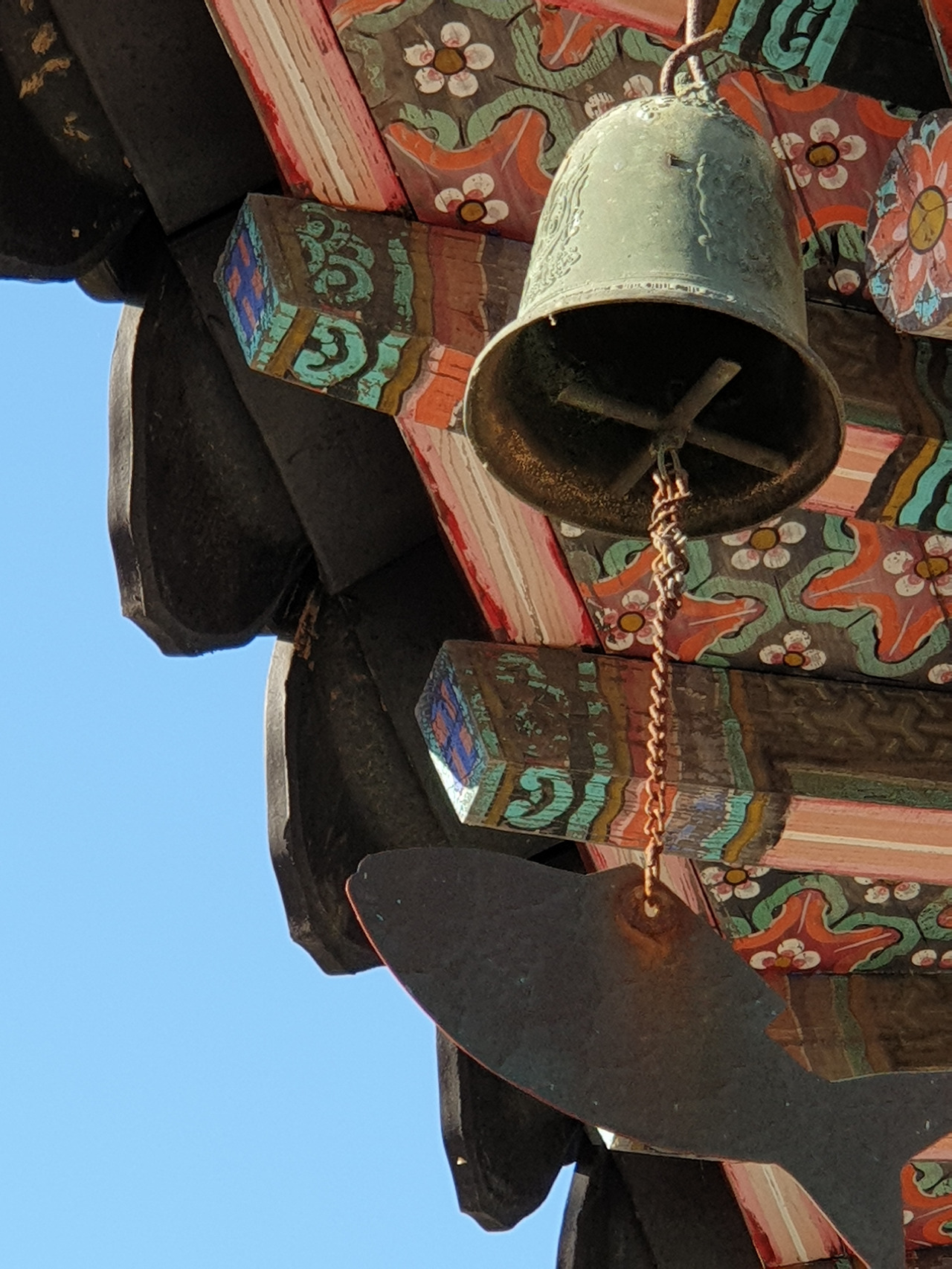 하산하는 길에 약수사에 들렀다. 스님은 앞마당의 꽃잔디 묘목을 다듬느라 바쁘고, 대웅전 뒤 뜰에는 홍매화의 색감이 곱다. 산신각을 따라 내려오니 대웅전 처마 끝에 매달린 풍경이 봄바람에 흔들리며 말을 건넨다. 풍경소리가 매우 쓸쓸하게 들리는 오후, 서녘에 걸린 저녁해가 모처럼 소도시 전체를 비추고 나는 돌계단에 아내와 말없이 앉아 햇살이 비추는 세상을 물끄러미 바라보았다. (끝)