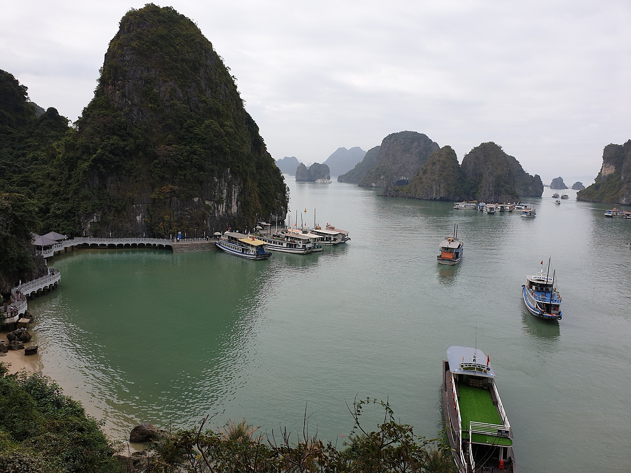 뱃머리를 돌려 이번에는 티톱 섬, 호찌민의 목숨을 구해주었다는 소련인 우주비행사의 이름을 붙인 섬이란다. 가이드는 수영과 산책 중 선택하라고 한다. 젊은 여행객 서넛이 수영을, 나머지는 모두 트레킹이다. 나도 수영 대신 트레킹이다. 내 나이에 수많은 사람 앞에서 몸매 자랑할 자신도 없고, 물도 차가울 것 같아서다. 가이드는 40분이면 충분하다고 하며 50분의 시간을 제시한다. 이미 책자로 섬 전망대에서 바라보는 경치가 절경이라는 것을 알고 있기에 나는 등반의 길로 접어들었다. 높이는 30미터 428개의 계단이라고 했다. 만만하게 보았는데 이게 아니다. 바위를 깎아서 계단을 만들었는데 그 경사가 심하다. 게다가 계단을 가득 점령하고 있는 중국인 일행으로 인해 올라가기가 번거롭다.