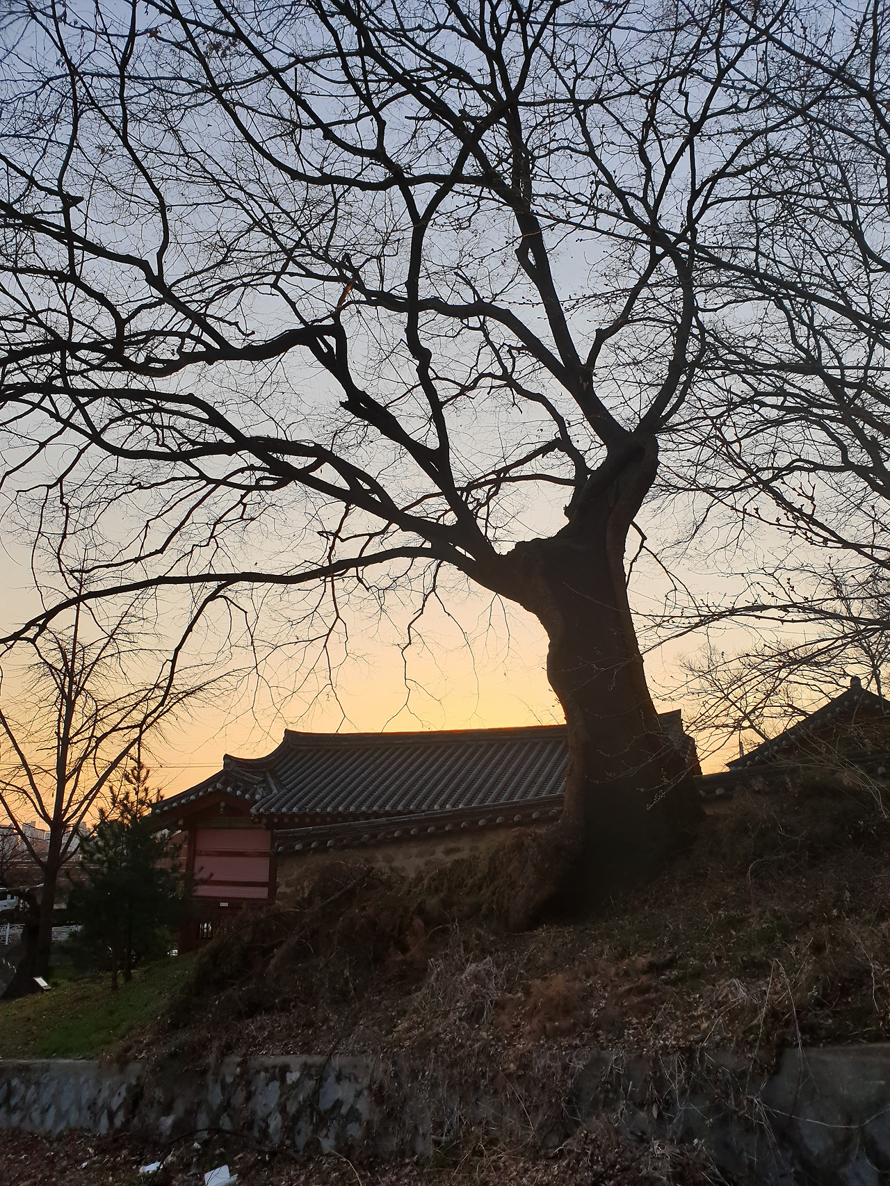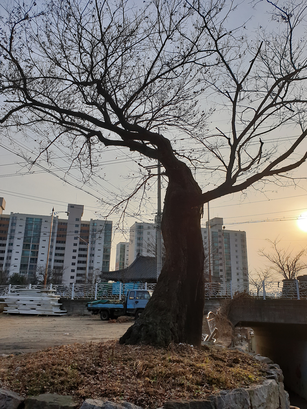 빈 가슴의 느티나무는 내가 사는 아파트 인근에 서 있다. 노트북 배낭을 메고 저녁 산책을 나설 때 선택하는 코스는 둘이다. 그냥 직진해서 아파트 – 성당 – 교육청 – 카페로 이어지는 코스와 돌아서 아파트 – 향교 앞 – 벽화 길 – 사거리 – 카페로 가는 길이다. 돌아가는 길은 때로는 도서관 쪽으로 더 연장되는 경우도 있다.