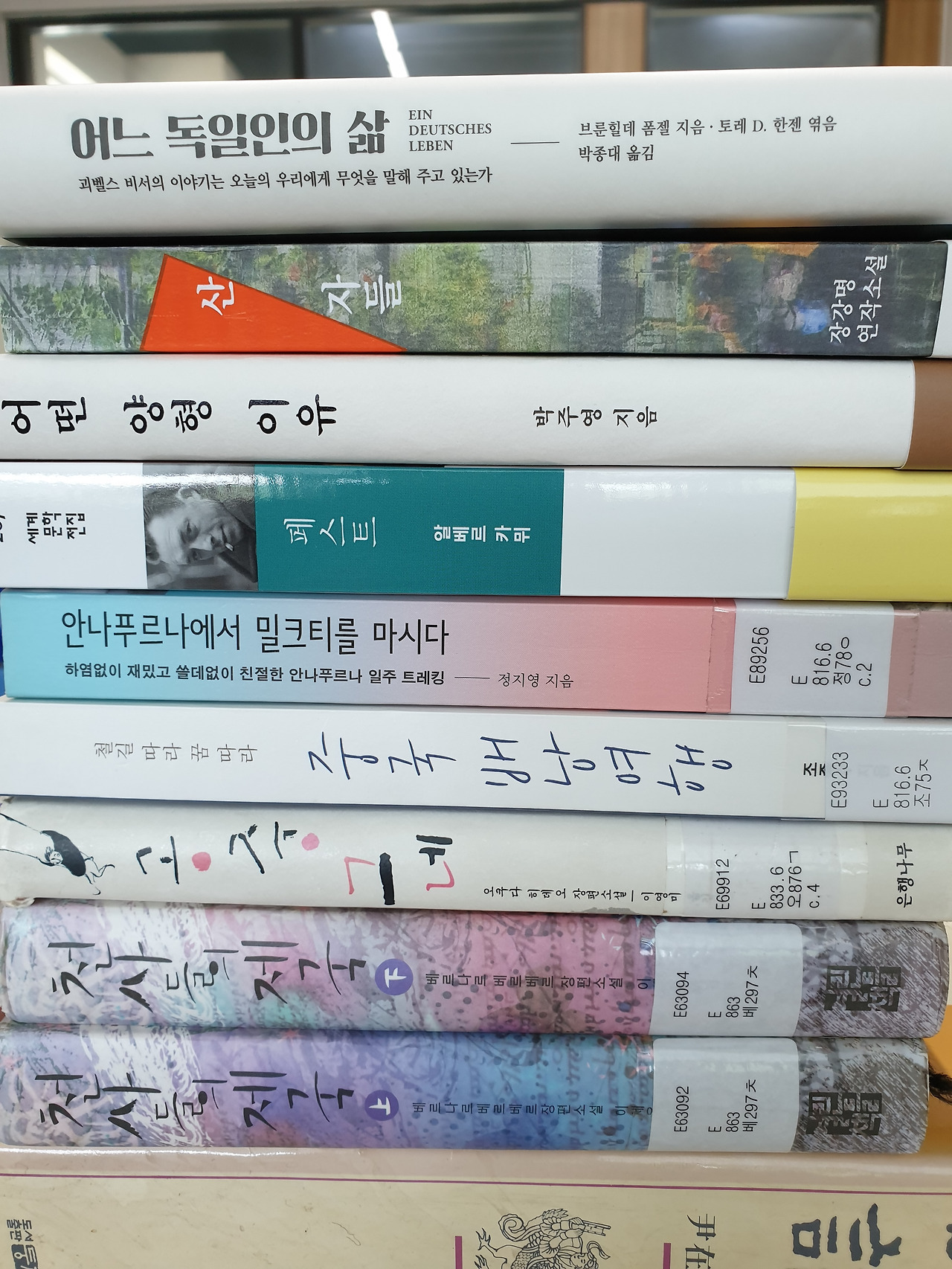 히말라야 여행기 2권, 중국 여행기 1권, 한국 작가의 신작 소설 3권, 무라카미 하루키의 소설 3권, 베르나르 베르베르 소설 2권 등등… 지난주 금요일 대학 도서관에서 빌리거나 최근 구입한 책들이다.