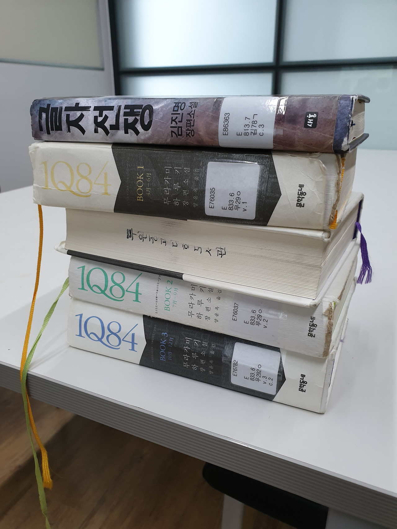 하루키의 경우 그의 첫 소설 『바람의 노래를 들어라』와 『노르웨이의 숲』에서부터 『해변의 카프카』,『어둠의 저편』, 『색채가 없는 다자키 쓰쿠루와 그가 순례를 떠난 해』 그리고 얼마 전의 『기사단장 죽이기』와 에세이를 읽은 적이 있지만 『IQ84』는 건너뛰었었다. 그런데 마침 대학 도서관에서 이 소설 세 권이 눈에 들어왔다.