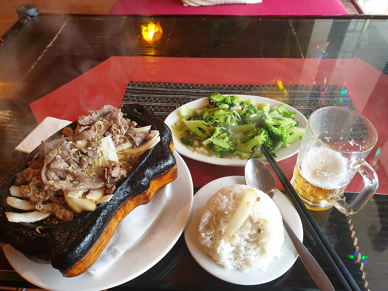 세시쯤 되어서 호텔 지배인에게 점심 먹을 만한 곳을 묻자, 내일 조식을 할 드래건 호텔의 레스토랑으로 나를 안내한다. 고기가 먹고 싶어 진 나는 쇠고기가 철판 위에 지글대며 나오는 한국의 불고기 비슷한 요리와 파슬리와 배추를 마늘과 함께 느억맘 소스로 볶은 야채 요리를 시켰다. 고수 향도 아닌 독특한 향신료가 사용된 것 같은데 전혀 거부감은 없다. 만약 야채를 시키지 않았다면 고기와 밥 둘로 먹어야 했는데, 두 가지 합해 우리 돈 7천 원 정도로 점심을 해결하고 우선 호텔로 들어가 쉬기로 한다.