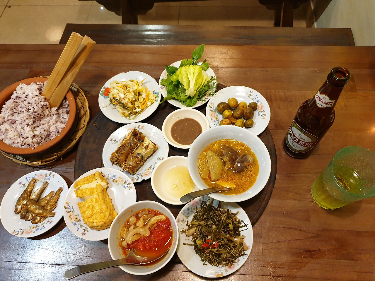 곧바로 식사가 나왔다. 자기에 담긴 밥과 국, 대멸치만 한 생선 튀김, 달래를 소금에 절였다가 볶은 것, 채소 무침, 두부와 소스, 베트남 롤 등이었다. 나는 튀긴 두부를 소스에 찍어먹었다. 아 이것은 튀긴 두부를 멸치젓갈에 찍어 먹는 맛이다. 투명한 소스가 아닌 멸치의 뼈와 살이 남아있는 거친 소스는 약간은 비릿하지만 맛있다. 국도 어제와는 다르게 된장을 약간 풀어 야채와 끓이면 비슷할 것 같다. 한 끼 오천 원, 베트남 전통의 집밥은 한국의 집밥처럼 맛있다. 가성비 최고다. 우연히 들른 식당에서 마주한 행운, 이게 사실 자유여행의 별미이다. 이름 난 맛집은 대체로 값이 비싸다. 그런데 그 맛이 기대를 배반할 때는 짜증이 나게 마련이다. 반면 기대 없이 들른 곳에서 반전은 늘 기쁨을 선사하는 것이다.