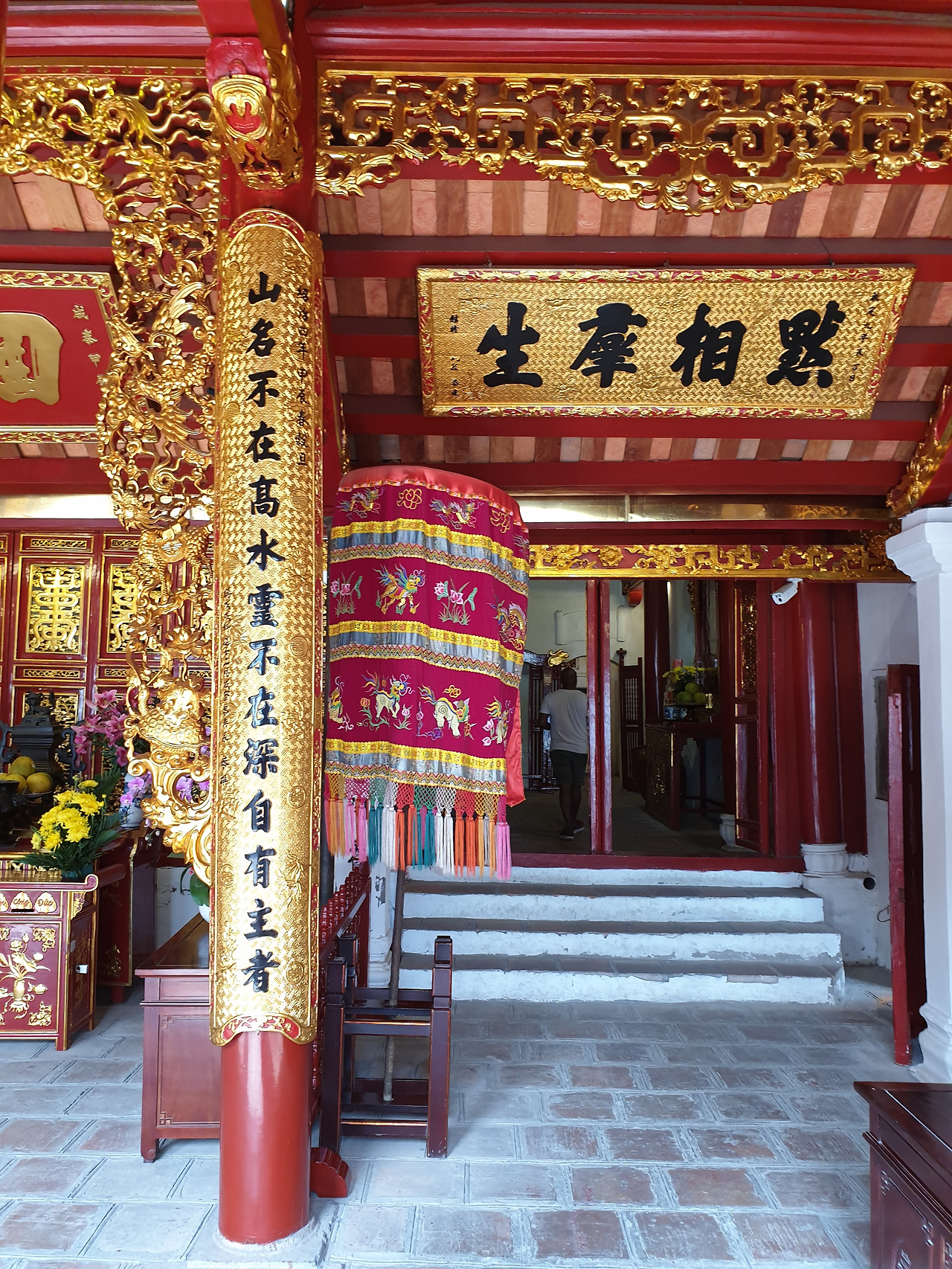 오전 10시가 되어서야 호텔을 나섰다. 오늘은 호안끼엠 호수 주변에 자리한 하노이의 구시가지를 산책하는 것이 일정의 전부다. 한 시간쯤 걸어 피곤할 무렵이면 찻집에서 주스를 마시며 사람 구경, 오토바이 구경하다가 상점에서 기념품도 잠깐 골라보면서 걷다 보니 호수에 도착했다. 그리 크지 않은 호수이지만 관광객들로 붐빈다. 나도 그들과 합세해 응옥 썬 사당을 둘러보았다. 입장료는 30만 동 우리 돈 천오백 원이다. 이 사당은 성인으로 대접받는 영웅 셋을 기린 곳이다. 또한 거북이(내가 보기에는 자라)와 관련된 전설도 곁들여지고 있다. 그리고 1968년 잡혔다는 길이 2m 무게 250킬로의 거북이 박제가 전시되어 있었다. 그곳 사당의 기둥에는 문인이자 대학자로 칭송되어 사당에 모셔진 ‘반 승’이 지은 시구절로 보이는 글귀가 새겨져 있었다. “산명부재고 수령부재심 자유주자”란 글이다.(원문은 사진 참조 바람)