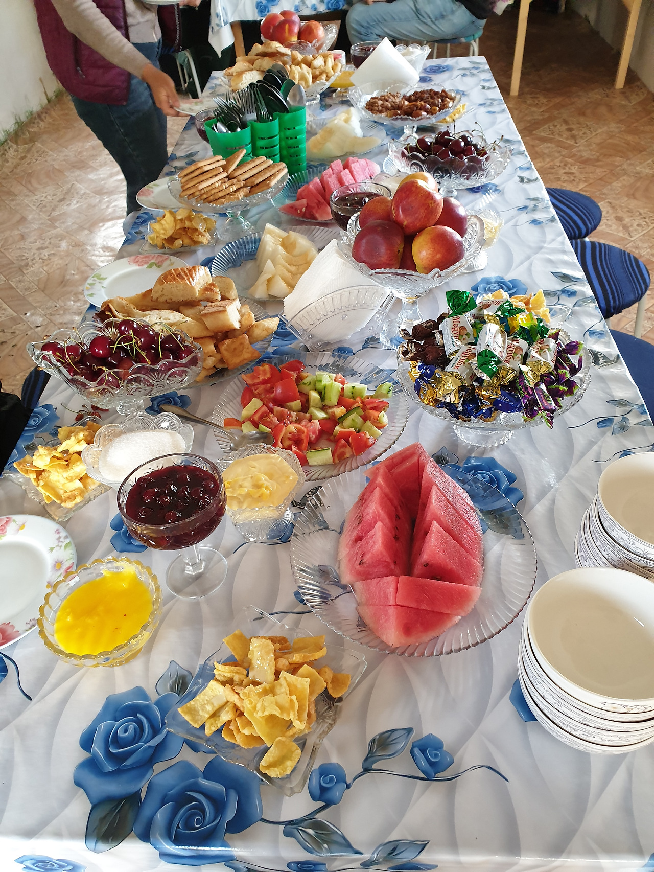 유르트의 주인 내외가 차린 저녁은 소고기와 야채로 만든 볶음밥인 쁠롭, 오이와 토마토 위주의 샐러드 그리고 굽거나 튀긴 빵과 버터, 베리로 만든 잼 등이다. 아울러 중앙아시아의 식탁이 그렇듯 과자와 사탕도 상에 올려놓았다. 고산지대라서 맥주 대신 우리는 뜨거운 차를 마시며 빵을 뜯는다. 그리고 비슈케크에서 출발할 때 사 온 수박, 중앙아시아의 멜론인 딩야, 체리를 후식으로 먹었다.