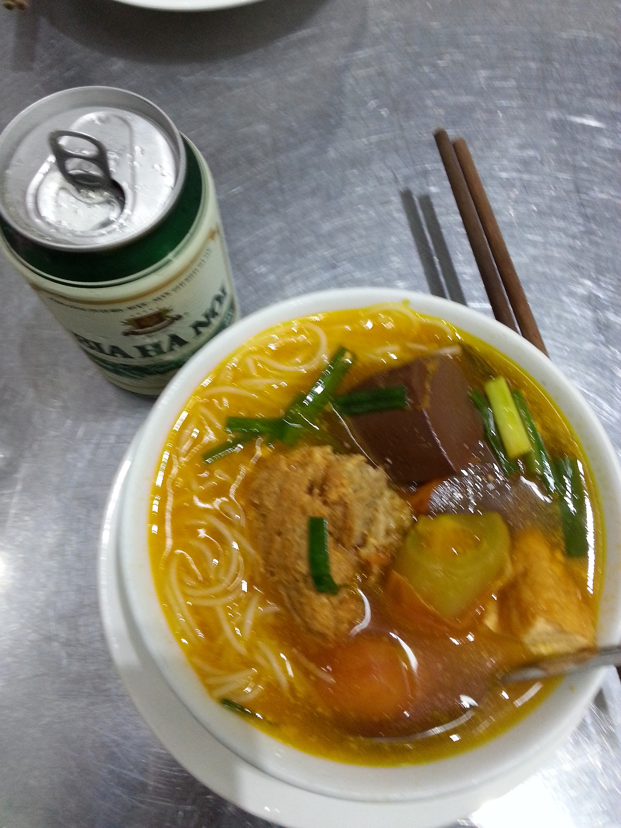 숙소에 대략 짐을 풀고 호찌민 시내를 산책하기로 하였다. 우선 먼저 벤탄 시장 근처의 쌀 국숫집으로 향했다. 1월에 김 교수가 나를 데리고 왔던 곳이다. 이곳에서 손님들이 주로 먹는 것은 소고기 쌀국수인 ‘퍼보’(pho bo)나 닭고기가 들어간 ‘퍼가’(pho ga)가 아니라 ‘분 리에우’라고 선지 덩어리와 베트남식 어묵, 고기완자 등을 향채와 함께 먹는 국수다.