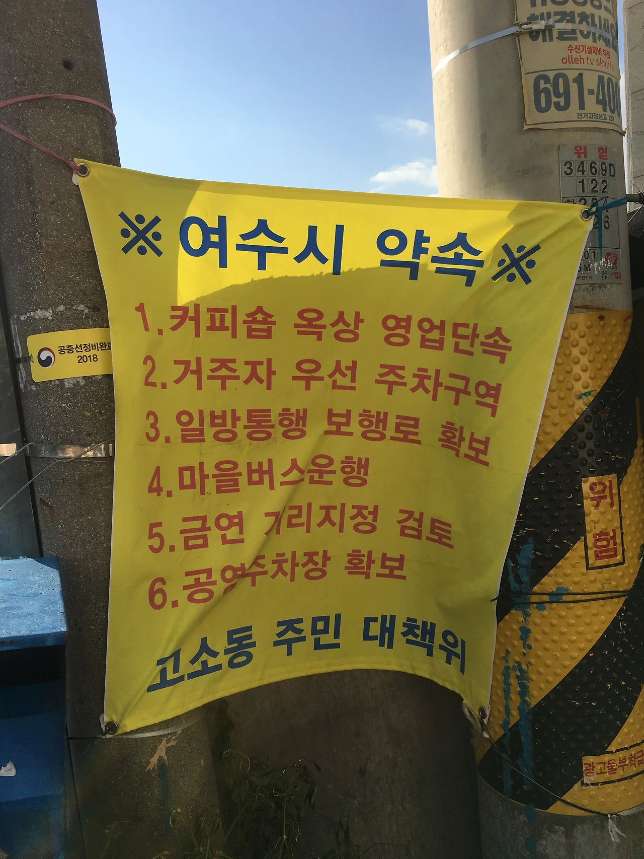1일 여행자가 바라본 여수는 너무나 아름다웠습니다. 하지만 모든 것이 아름답기만 하기는 힘든 걸까요? 동네 곳곳에는 여행자들이 주거지에서 너무 시끄럽게 해서 생기는 문제들에 관한 현수막이 붙어있었습니다. 택시를 타니 라디오에서 길거리 포차의 존폐 이전에 관한 문제를 다루고 있더라고요. 여행자 입장에선 그곳이 주거지이기에 고즈넉하게 여행을 즐기기에 적합하다고 생각하지만, 거주자 입장에선 주거지이기 때문에 여행자들의 소란이 불편했던 것 같습니다.