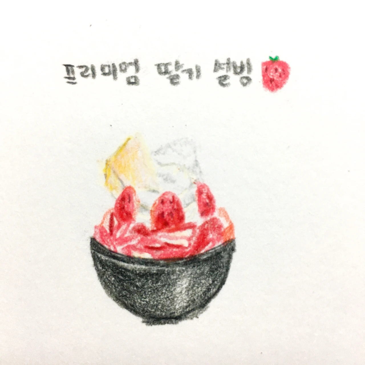 평소에 종종 연필로만 스케치를 했습니다. 하지만 항상 허전함과 부족함을 느꼈어요. 저는 주로 과거에 찍었던 사진을 보고 그대로 그리는 경우가 많습니다. 내가 기억하는 사진 속 추억은 흑백으로 표현될 수 없는, 색이 가득한 추억이기에 색연필이 자꾸만 생각났습니다. 오늘은 어제 먹었던 딸기 설빙을 그림으로 그려봤습니다. 이 그림을 연필로만 그렸다면 얼마나 슬펐을까요. 겨울에 제철인 딸기는 제 스케치북에서도 제철을 맞았습니다. 딸기의 빨간 색은 언제나 설레는 색입니다.