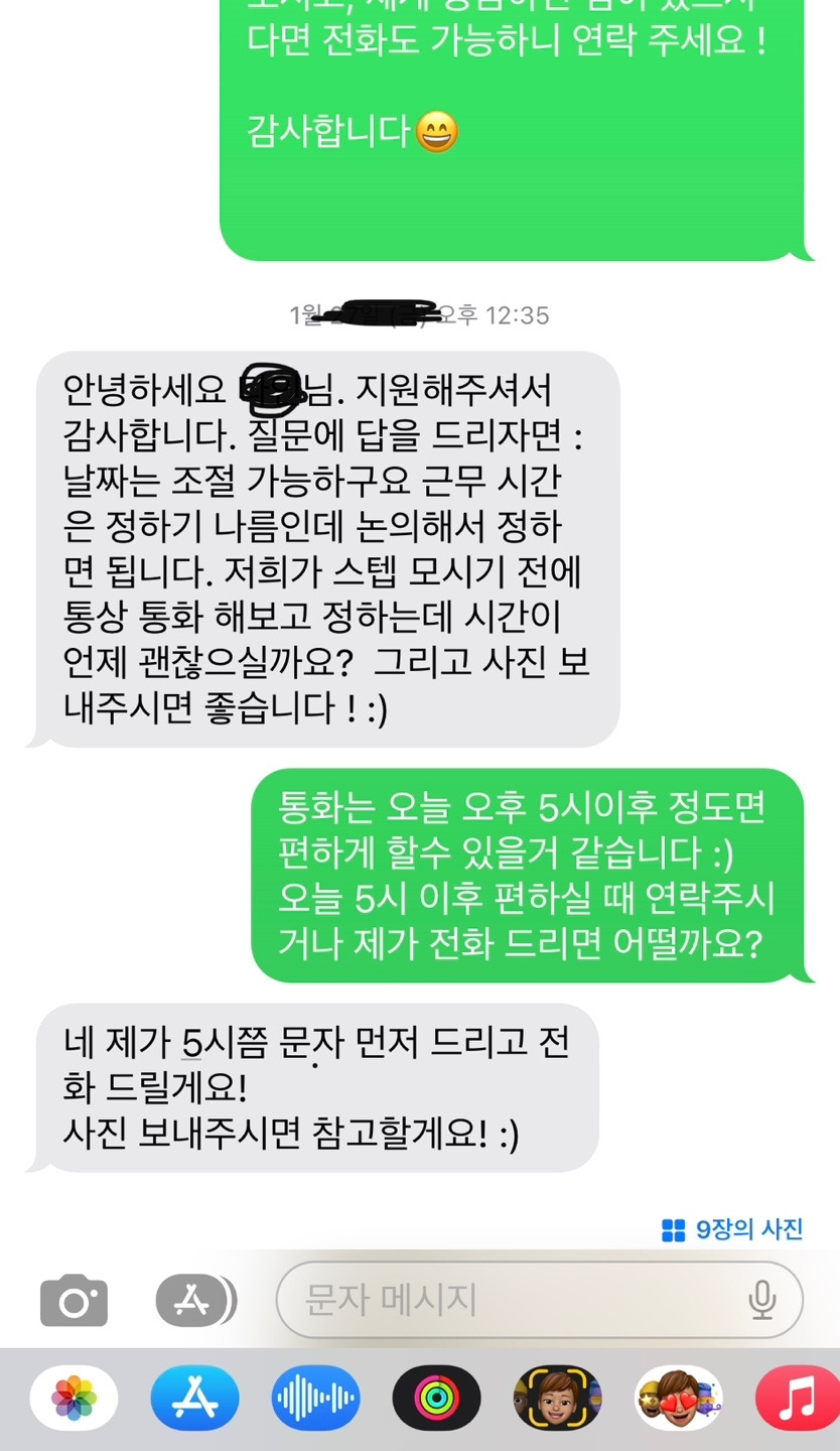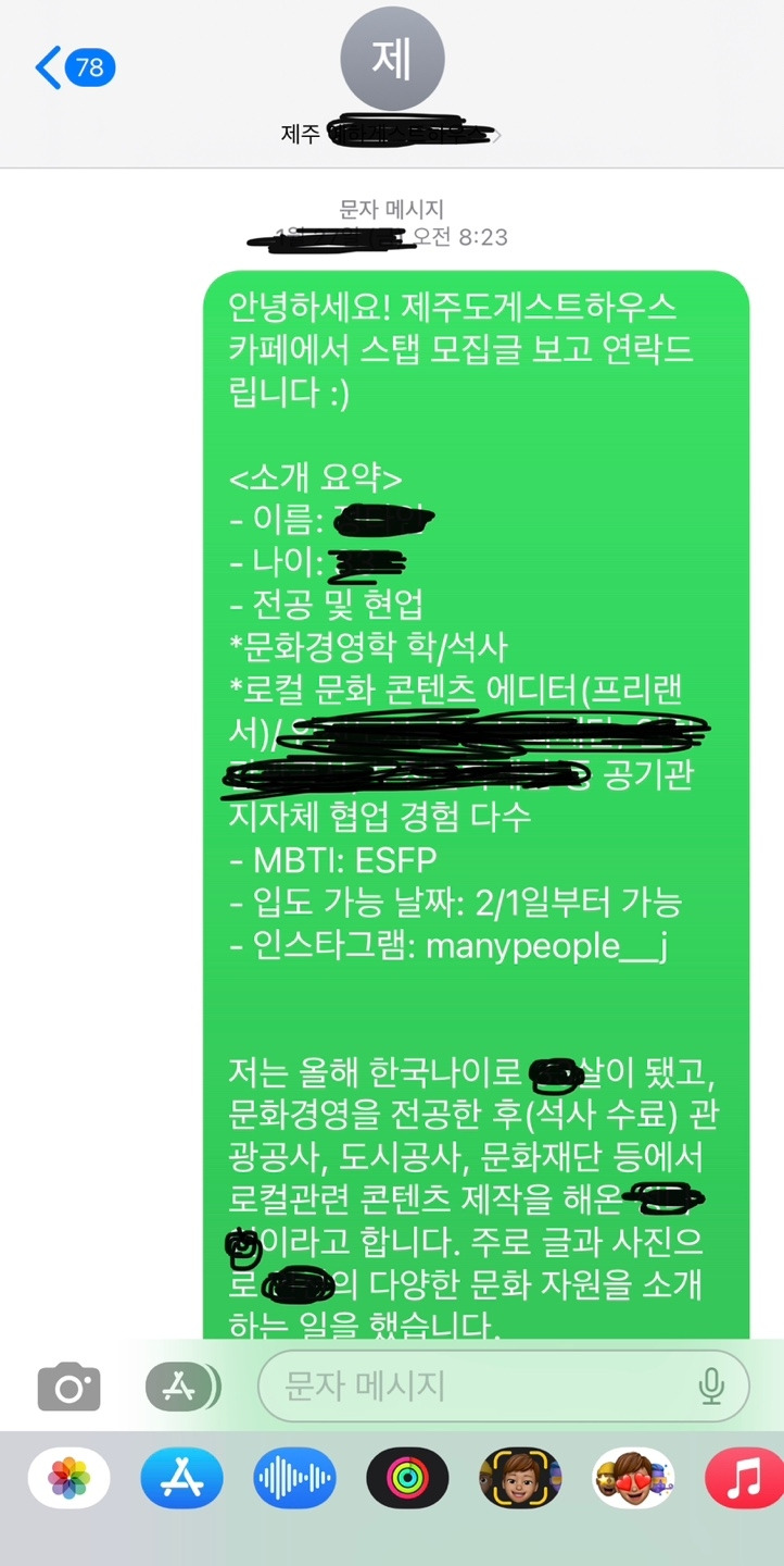 꽤 장문으로 소개글을 써서 보냈던 첫 문자에 (왼쪽사진) 대한 답장을 받은 건 다음날 점심즈음이었다. 사실 점심시간이 되어도 문자 답이 없길래 역시 나이가 문제일까 싶어서 마음을 내려놓고 있던 중이었다. 답장은 다행히도(?) 긍정적이었다. 대면 면접이 불가능한 대신 사진 몇 장 첨부해 달라는 요청이 있었고, 그날 저녁 이십 분 정도 전화 면접을 보았다. 문자로 보내드린 나의 지난 여러 일들, 왜 이 게스트하우스를 선택했는지 등을 물으셨고, 게하 선택에 대한 요인은 위의 조건을 기반으로 차분히 대답했다.