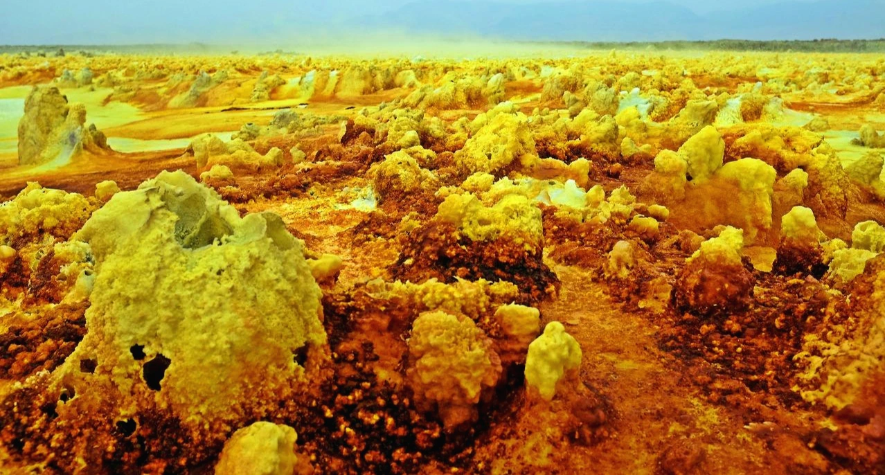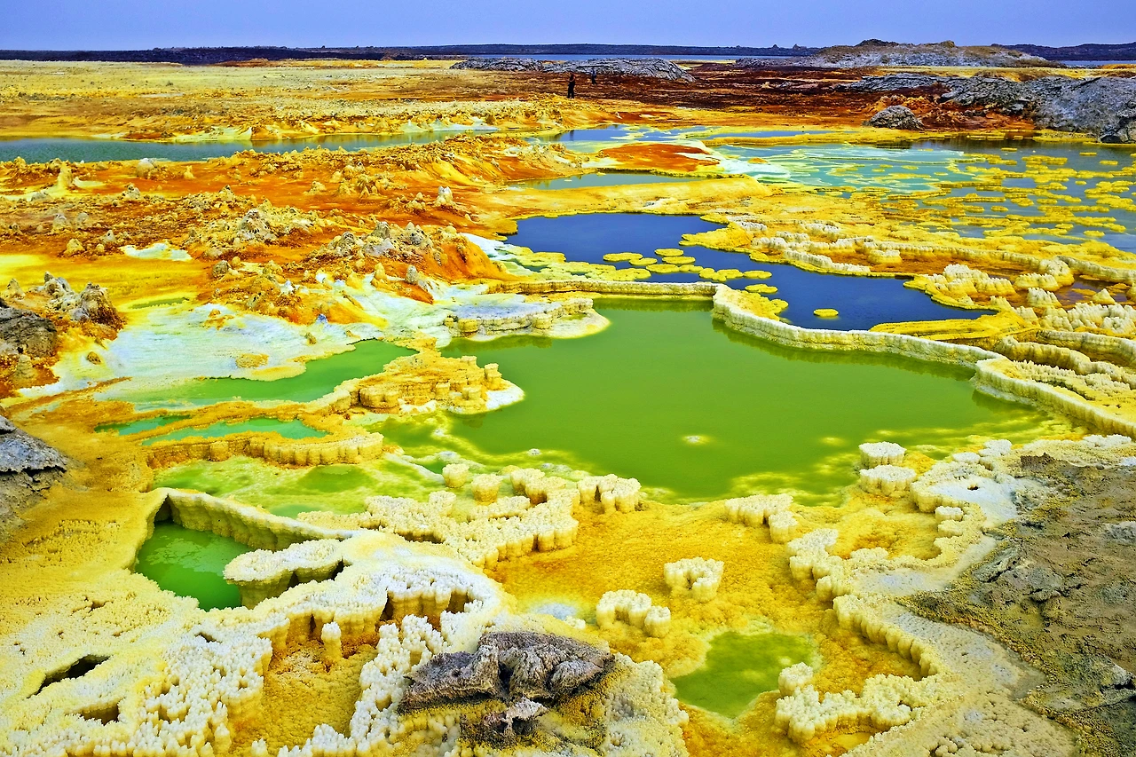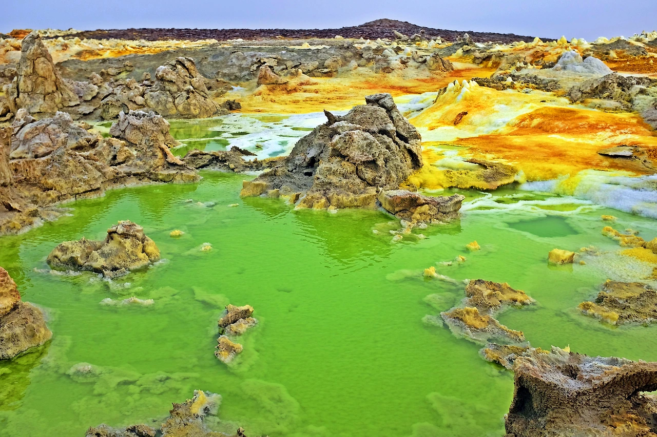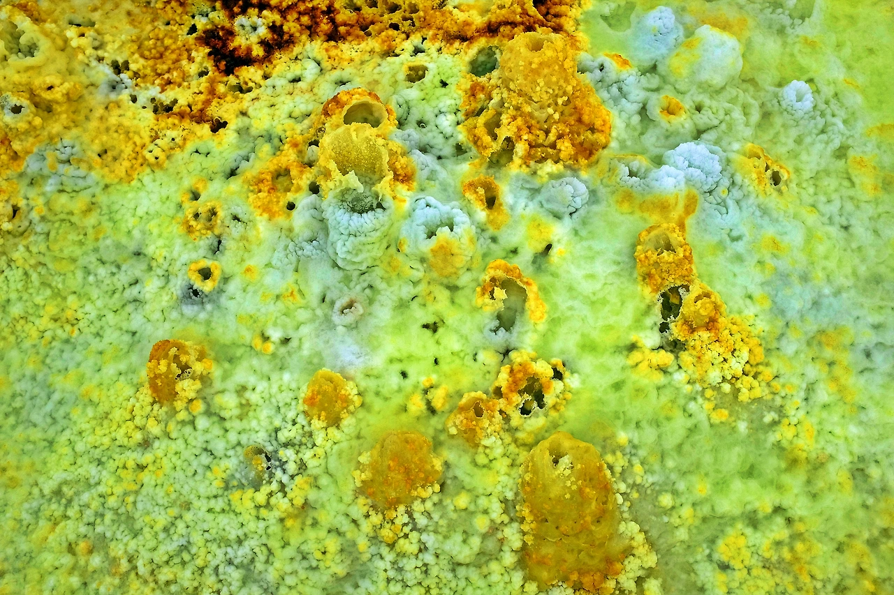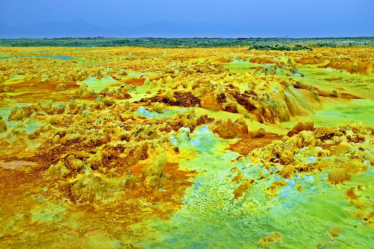 지구를 뚫고 올라온 유황과 각종 광물들이 지표면의 소금과 만나 비현실적인 모습을 만들어낸다.