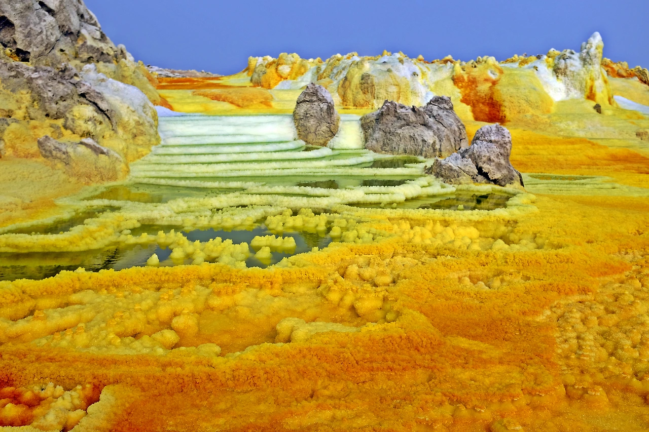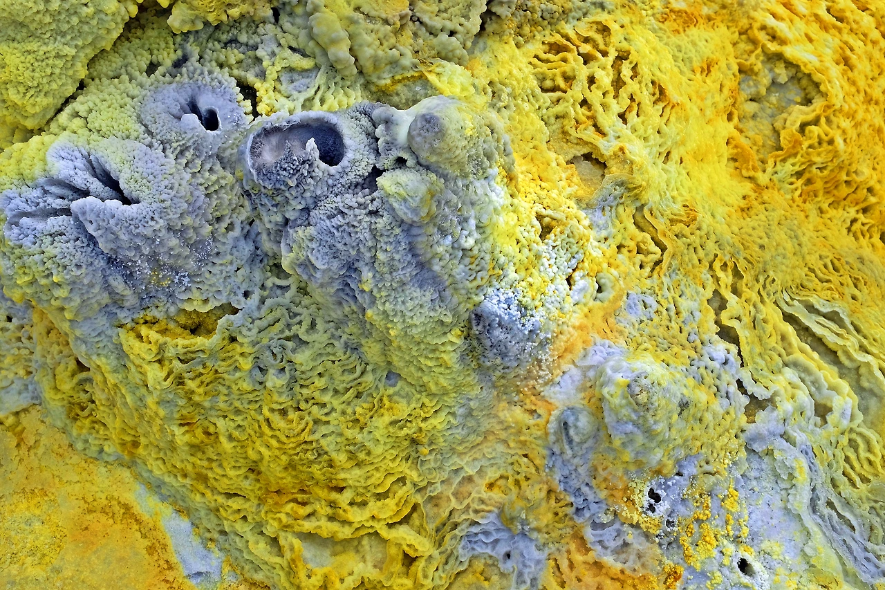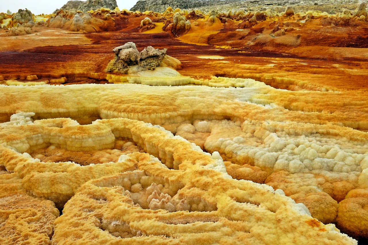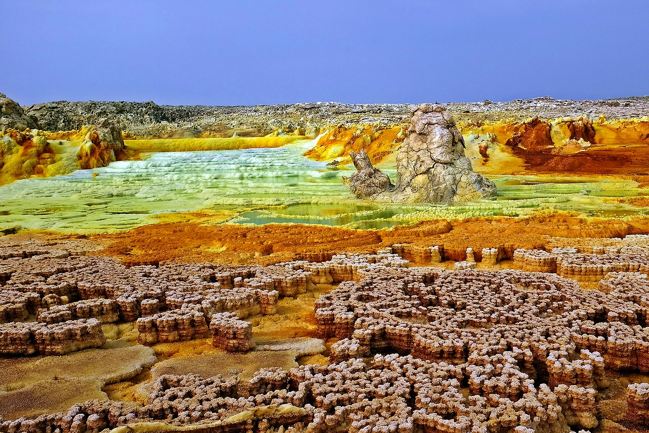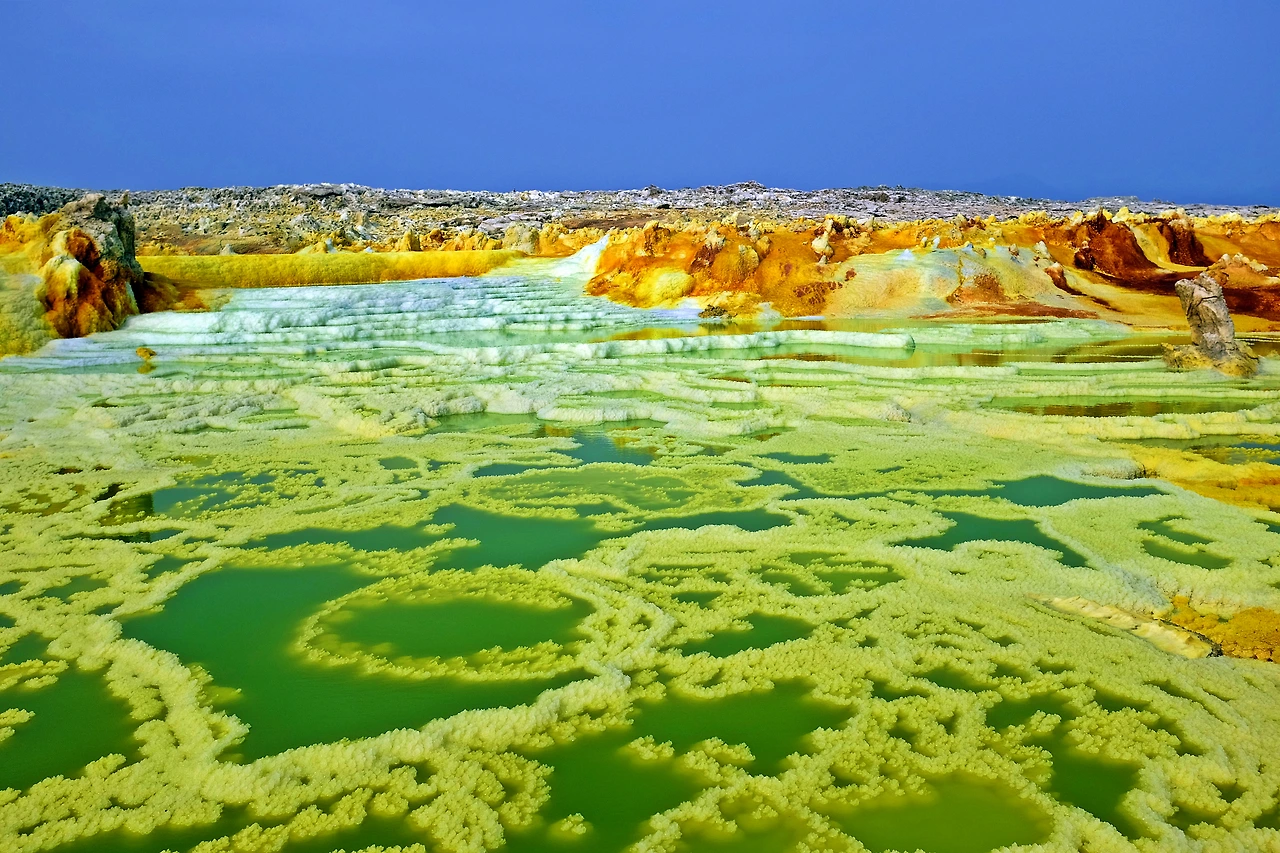 지구를 뚫고 올라온 유황과 각종 광물들이 지표면의 소금과 만나 비현실적인 모습을 만들어낸다.