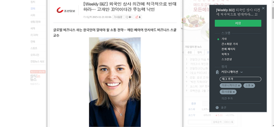 노트북 설정이 어느 정도 완료되고 난 후, 웹 클리퍼(Web Clipper)로 자료를 수집해본다. 웹 클리퍼를 실행하면 '정리'라고 되어 있는 부분이 있다. 그 부분에서 노트북과 태그를 설정할 수 있다. 이 기사는 직장 내 외국인 상사와 어떻게 소통할 것인가에 관한 내용이다. 이 기사는 '커뮤니케이션' 노트에 해당하고 '회사 생활', '커뮤니케이션', '소통'로 태그를 지정할 수 있다.