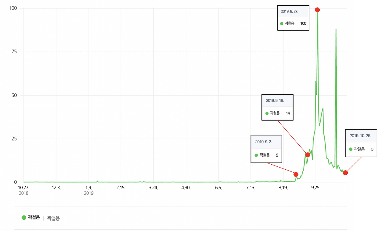 내 페이지에 ‘시구 사진’이 올라왔을 때 검색량은 14로 대중들이 점점 곽철용에 관심을 보이기 시작했을 때였다. 그 이후 9월 27일에 검색량이 정점을 찍고 그 이후로 단 두 번을 제외하고는 검색량이 내리막을 타기 시작했다.