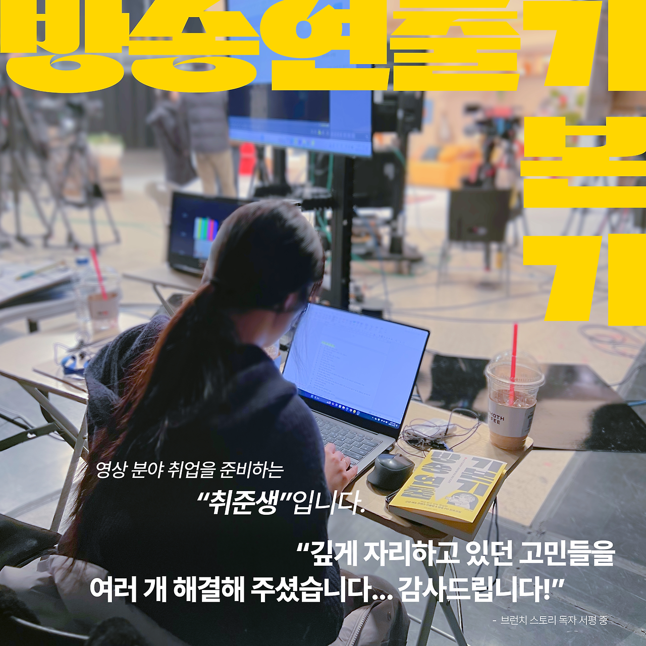 이 브런치북, 에세이도 아닌데 20대 여성과 30대 여성이 많이 봤다. 특히 20대 여성이 많이 봤네. 방송에 흥미가 있는 20대 사회초년생이 많이 봤는가 보다. 그렇다면, 그들이 선망하는 방송 촬영 현장에서, 20대 여성 스태프가, 내 책 <방송 연출 기본기>를 읽고 있다면? 아, 나쁘지 않은데. 그렇게 찍어야겠다. 그리고 나의 오래된 벗인 동갑 카메라 감독님의 손을 빌려 방송 스튜디오 녹화날, 찍어버렸다.