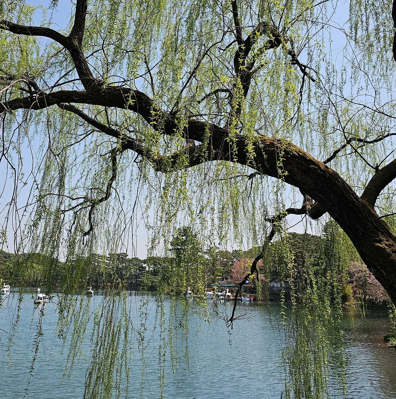 호수 주변에 심어진 벚꽃들이 흐드러지게 피어 바람이 불면 하나둘 떨어져 강바람에 흩날리고 있다. 온통 세상은 하얀 꽃밭이 되었다. 호수 물가를 따라 길게 늘어진 능수버들이 연둣빛 머리카락을 흔들며 수면에 살짝 닿는 듯하다. 호수 위는 오리 배들이 둥둥 떠 다니며 놀고 있고, 햇빛을 받은 소나무 그림자가 물결 위에 살랑살랑 춤을 춘다.