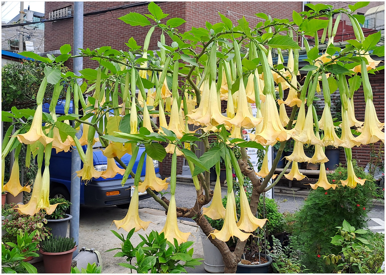 바로 그 옆 세탁소 집 마당에는 하늘을 안 보고 땅만 바라보며 노랗고 풍성하게 많은 꽃을 피우고 있는 천사의 나팔꽃(angel trumpet)이 우리를 반긴다. 긴 트럼펫 모양으로 길게 늘어 뜨려 진 모습이 장관을 이룬다.