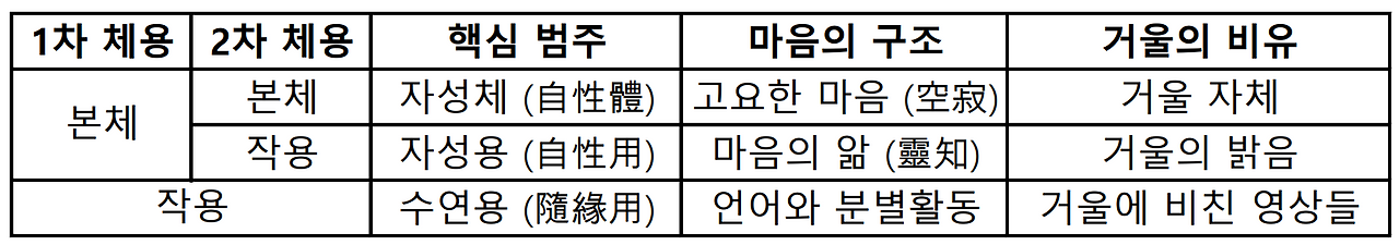 지눌은 '밝은 거울'과 '거울에 비친 영상들'의 관계를 체용으로 설명한다. 그가 '밝은 거울'을 자성으로 '거울에 비친 영상들'을 수연이라고 부른 것도 이런 이유에서이다. 여기서 수연이란 말은 "어떤 조건 (여기서는 외부 대상)을 따른다"라는 뜻이다. 결국 거울의 자성과 수연이란 것은 '밝은 거울'이 외부 대상에 따라서 영상들을 만들어낸다는 것을 의미하는 표현이라고 할 수 있다. 그런데 중요한 것은 지눌이 '밝은 거울' 자체도 이제 체용으로 다시 나누어 설명한다는 점이다. '거울의 바탕'이 체라면, '거울의 밝음'이 용이라고 본 것이다. 이 때문에 결국 자성도 둘로 나뉘어 '자성체'와 '자성용'으로 구분되었다. 이어서 지눌은 거울 비유를 마음의 내적 구조에도 그대로 적용시킨다. 그의 설명에 따르면 고요한 마음이 자성체이고, 마음이 항상 무엇인가를 알 수 있는 능력이 자성용이다. 결국 자성체와 자성용의 마음 상태가 우리 마음 본체, 즉 자성에 해당한다고 할 수 있겠다. 이 시점에서 보면 아직 우리 마음은 어떠 외부 대상과도 만나지 않은 상태이다. 선종에서 자주 강조한 '자성청정심'이란 바로 이 상태의 마음을 가리키는 것이다. 지눌은 이제 외부 대상과 만나서 언어와 분별 활동을 하는 '자성청정심'은 수연용의 상태에 있는 것이라고 설명했다.