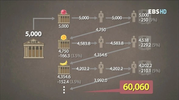 한국은행이 애플 은행에 5000억 원을 대출로 공급합니다. 그럼 애플 은행은 이 돈을 대기업 사장 남자 1호에게 대출해주죠. 남자 1호는 그 돈을 A에게 재료값으로 줍니다. A는 그중에서 5% 정도인 250억 원을 회사 금고에 현찰로 넣어 두고 쓰고 나머지 4750억 원은 은행통장에 예금해 놓고 사용한다고 가정하겠습니다. 이 돈은 오렌지 은행에 A의 예금계좌로 들어가게 됩니다. 그럼 오렌지 은행은 A가 예금한 돈의 3.5%인 166억 3천만 원을 지급준비금으로 떼어 놓습니다. 그리고 나머지 4583억 8천만 원을 남자 2호에게 대출해 주죠. 남자 2호는 B 씨에게 지불하고 B 씨는 역시 5% 정도만 현찰로 두고 나머지 금액은 바나나 은행에 예치합니다. 이런 식으로 계속 반복되죠.