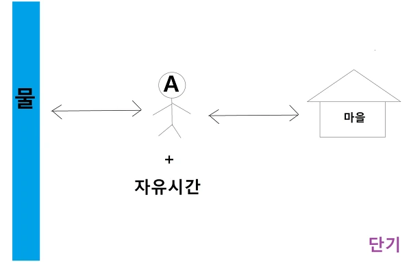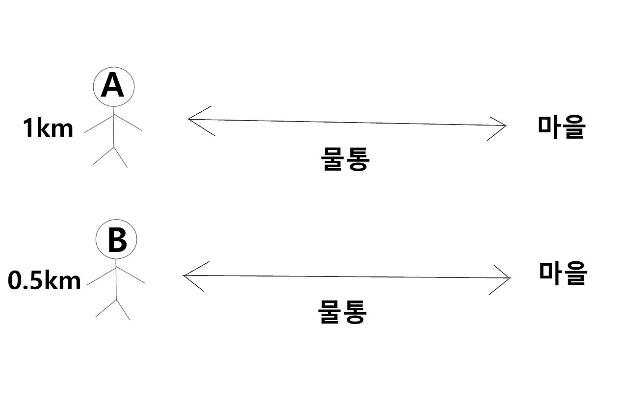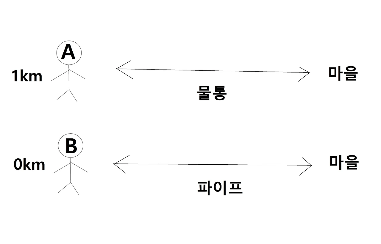 A는 물통을 들고 강에서 물을 퍼서 마을까지 걸어가 주문한 사람에게 준다. 하루에 100번만 하고 자유시간을 가질 수 있다. B는 물통을 들고 강에서 물을 퍼서 마을까지 걸어가 주문한 사람에게 준다. 하루에 100번만 하고 그날 번 돈을 파이프 라인 건축일에 투자한다.