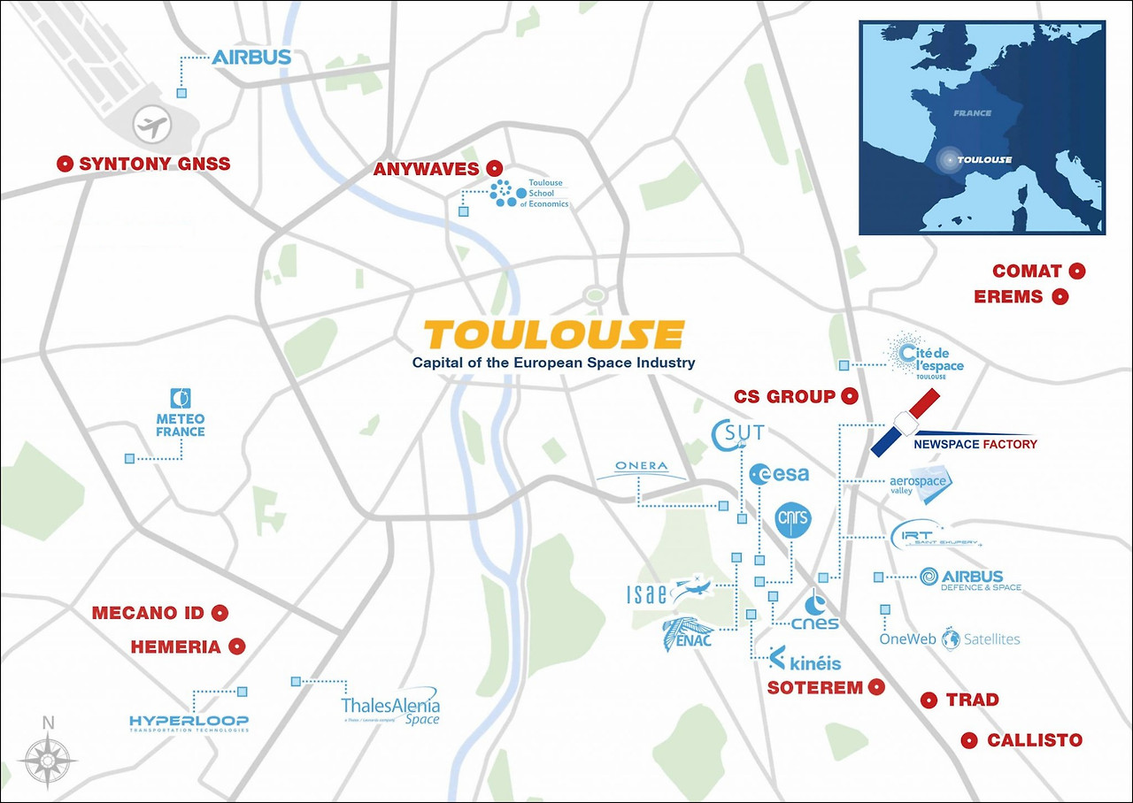 툴루즈와 보르도에 집중되어 있는 항공우주 엔지니어링 회사들과 연구센터들은 ‘에어로스페이스 밸리(Aerospace Valley)’라는 클러스터를 이루고 있다. 이 클러스터의 일부로 툴루즈에는 우주 분야 스타트업과 중소기업이 집적되어 있는 지역 ‘뉴스페이스 팩토리(NewSpace Factory)’가 있다. 이 곳에 위치한 기업들의 역량은 전문 엔지니어링, 인공위성 유닛, 소형 플랫폼, 테스팅 장비, 지상국 소프트웨어, 지상국 안테나 등 우주 산업의 전 가치가슬이 망라되어 있다. 이들은 250개의 프로젝트를 진행했고, 이 중 40개가 현재 궤도 상에 있다. ‘뉴스페이스 팩토리’를 구성하는 주요 기업은 다음과 같다.