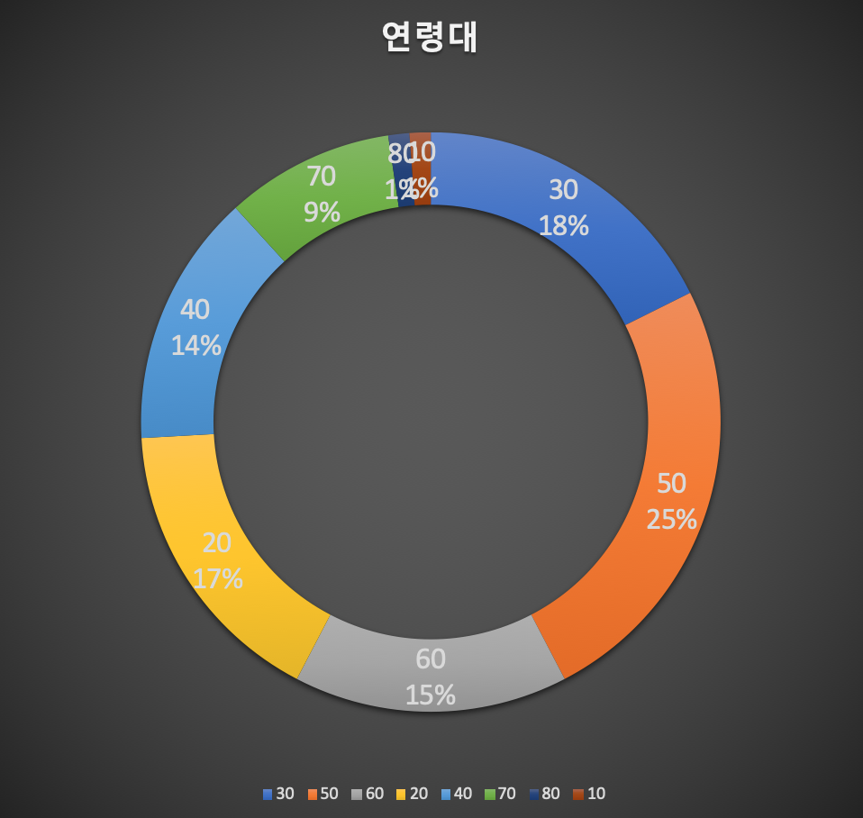 마지막으로 알아볼 것은 환자의 나이다. 역시 데이터가 불충분하다, 전체 확진자수의 7%, 85명만 환자의 나이를 알고 있다. 그중 가장 많은 연령대는 50대 (25%)이고, 30대와 20대, 60대가 비슷한 수준을 보이고 있다. 10대와 80대는 1%로 낮은 편인 것이 다행이라면 다행이다.