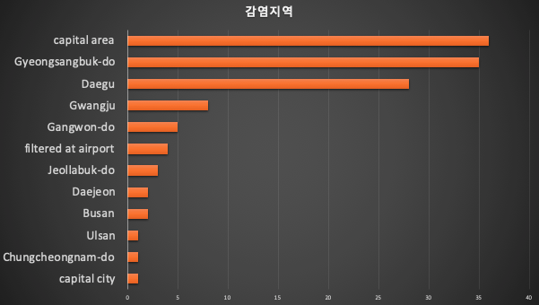 감염지역 역시 데이터가 불충분하다. 10% 정도만 파악이 되는데, 그중에서는 서울이 가장 많다. 그다음을 경상북도가 바짝 뒤쫓고 있고, 밑에는 대구가 따라온다. 나머지 지역은 확진자가 10명 미만으로 적다.