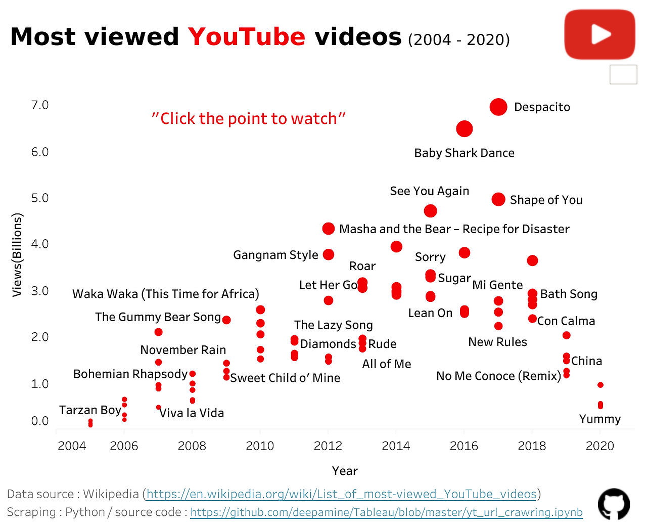 출처 : 위키피디아 (https://en.wikipedia.org/wiki/List_of_most-viewed_YouTube_videos)