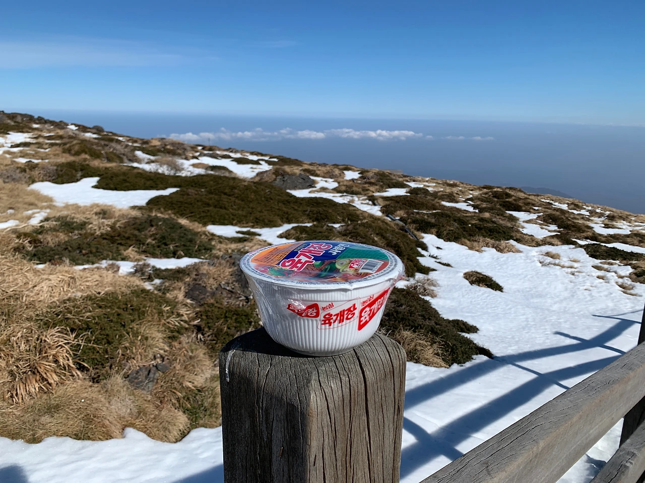 가까운 회사 동료들은 나의 연애 혹은 비 연애를 가벼운 스낵처럼 즐기곤 한다. 나보고 연애를 린(lean)하게 한다며 놀리는 사람도 있다. 여행을 떠나기 며칠 전에 내가 주로 협업하는, 모두 여성으로 구성된 팀과 커피를 마셨다. 혼자 제주에 간다고 하자 그들은 제주도는 혼자 갔다가 둘이 되어 돌아오는 경우가 많다면서 몇 가지 방법을 제시했다. 핫한 게스트하우스에 묵으라던가, 카페에서 혼자 책을 읽어보라는 평이한 것도 있었고, 어차피 쓸 일도 없는 종이명함, 한라산 오르면서 눈 바닥에 한 장씩 뿌리라는 어이없는 조언도 있었다. (그들은 헨젤과 그레텔 같다며 키득댔다.) 그중에는 그래도 묘하게 설득되는 게 하나 있었는데, 그건 바로 한라산에 두 개의 컵라면을 가져가라는 조언이었다. 백록담에 도착한 다음 혼자 온 여성을 찾아 그녀와 나눠먹으라는 것이다. 추울 때 컵라면은 엄청나게 맛있고, 힘들 때 받은 도움은 생각보다 힘이 세다고. 그 자리에서는 웃어넘기고 말았지만, 한라산을 오르기 직전에 들른 편의점에서 그 조언이 떠올랐다. 그래서 정말로 컵라면을 두 개 샀다. 곁들일 모차렐라 치즈도 함께.
