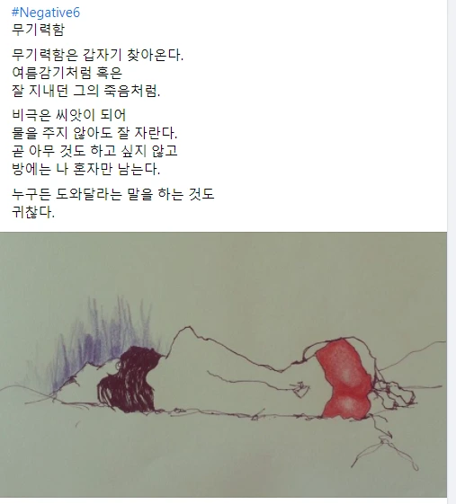 사실 오늘은 달리기에 대한 반성조의 글을 쓰려고 했다. 겨울이 되고서 달리는 빈도가 급격하게 줄었기 때문이다. 얼마 전 오랜만에 호수에 나가보니, 호수는 이미 흐물거리며 녹고 있었다. 한낮의 태양을 견디지 못하는 것이다. 호수가 언 것도 몰랐는데 벌써 녹고 있다니. 살짝 충격을 받아 그걸 주제로 글을 쓰고자 '호수가 녹는다'라는 제목을 적고 나니 김수영 시인의 <풀>이 생각났고, 그렇게 시를 생각하다 보니 예전에 나에게 있었던 일들이 생각났다. 시를 쓰고 그림을 그리던 시절이었다. 그걸 정말로 오랜만에 찾아보았다. (페이스북에 박제되어 있고, 무려 8년 전이다.)
