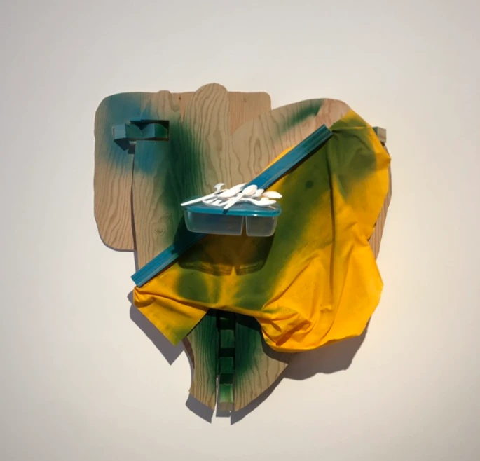 리처드 터틀은 버려졌거나 버려져야 할 것 같은 사물들을 모아 작품을 구성한다. 이런 아상블라주 작품들은 대부분 나무판자를 겹쳐서 캔버스처럼 쌓고 그 위에 무언가를 더 하거나 스프레이를 뿌리는 방식으로 제작되었다. 판자 군데군데 작은 나무 조각을 이용해 만든 입체 형태는 마치 주택 지붕처럼 보인다. 아파트형 공장을 연상시키는 격자무늬도 반복적으로 등장한다. 건축적 맥락 안에서 무언가를 이야기하는 듯하다. 누군가의 집, 일터일까? 어떤 작품에는 플라스틱 밀폐용기 위로 일회용 숟가락이 수북하게 쌓여있다. 거기에선 밥벌이와 관련된 일종의 애환이 느껴졌다.