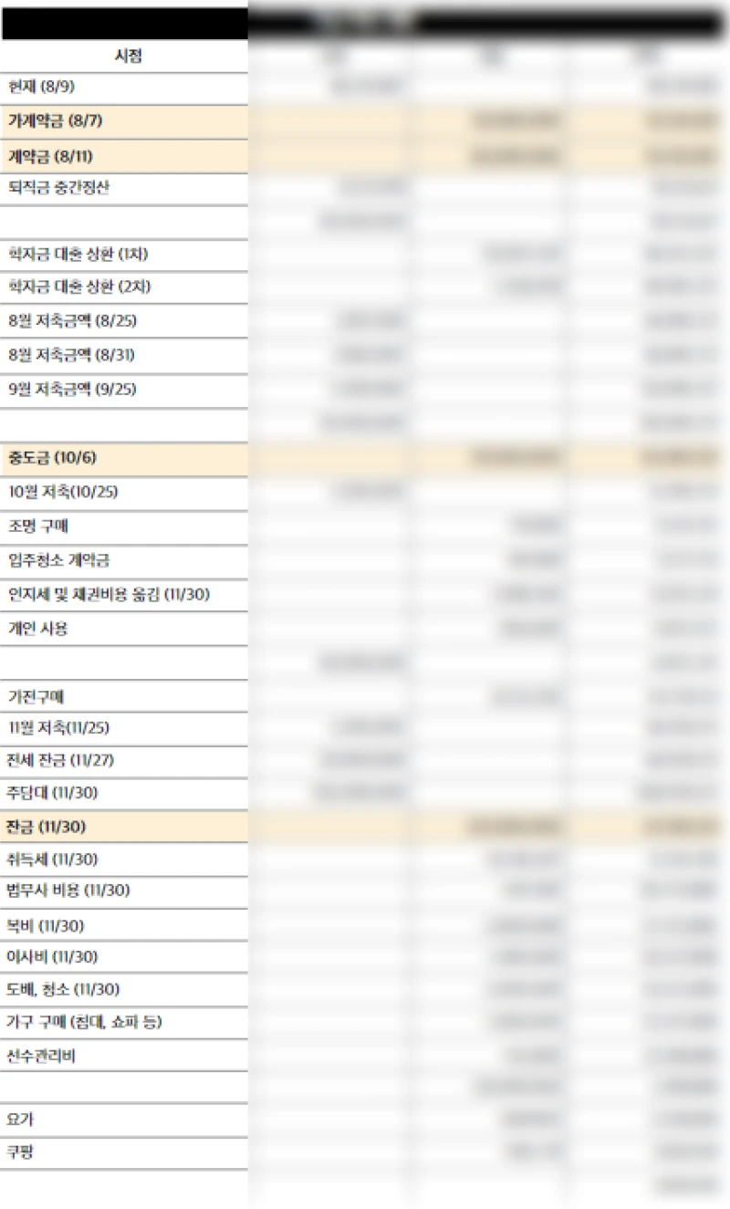 우리는 집을 살 때 한 번에 돈을 다 내는 것이 아니라 계약금, 중도금, 잔금으로 나눠서 돈을 지불한다는 사실을 간과하지 말아야 한다. 예산의 대부분이 잔금 대출일 것이기 때문에 중도금까지의 자금 계획이 너무 중요했다. 나는 잔금 대출이라 잔금일 날 큰돈이 들어오기 때문에 그전 까지는 타임라인 별로 촘촘히 가용 자금을 계산해야 했다.