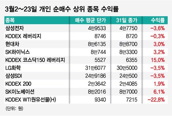 개인들의 순매수 종목 및 수익률(출처 : 머니투데이 4.1일 기사)
