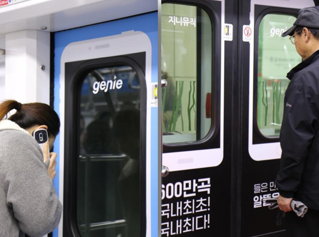 출퇴근길 매일 타고 다니는 지하철 창문을 유심히 지켜보았다. 보다 보니 그 모양이 핸드폰과 유사하다는 생각을 하게 됐다. ‘어라, 그러고 보니 나는 스마트폰 속 앱 서비스를 홍보하는 마케터인데? 지하철 출입문을 핸드폰 모양으로 랩핑 하면 어떨까? 가운데 로고를 박으면 우리 서비스잖아?' 약간의 포토샵 작업을 통해 아이디어를 비주얼화 해보았고 될 것 같다 싶으니 곧바로 제안했다. 결국 이 아이디어가 받아들여져서 신분당선에 아래와 같은 디자인으로 열차가 랩핑 되게 됐다. (*초기에 제안했던 이어폰은 삭제됐고 아티스트 초상은 열차 좌석 칸 위에 위치됐다)