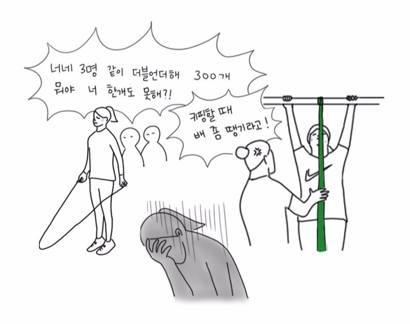 크로스핏 시작한 지 3개월 차, 매일매일 왔으니까 못해도 약 100일은 한 건데 여전히 못하는 것들 천지였다. 못하는 것, 그중에서도 더 못하는 것들이 산재하는 이 정글 같은 곳에서 나보다 센 포식자들은 늘 무섭고 두렵기 마련이었다. 저녁 반에서 같이 운동하는 언니가 얼굴을 한껏 찌푸린 채 내 앞에 독불장군처럼 서있었다. 그 모습이 무섭고 싫었지만 찍소리도 하지 못했다. 그저 바닥에 떨어진 줄넘기를 다시 잡을 뿐.