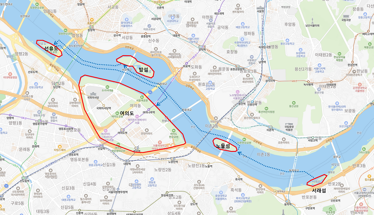 서래섬부터 시작해 노들섬, 밤섬, 선유도를 지나 여의도에서 내린다.