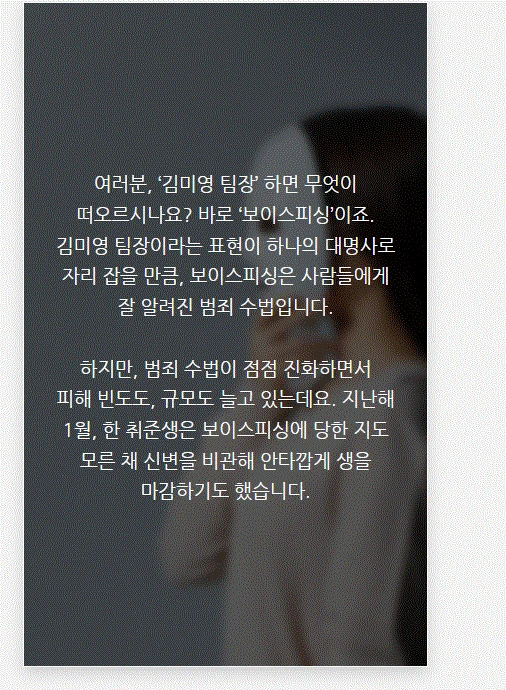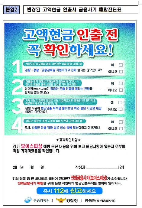안녕하세요, 서울 중앙 지방검찰청 김 00 수사관입니다. 이렇게 수사관을 사칭하면서 할머니 주민등록번호 주소 자녀 이름 등을 정확하게 말해서 할머니께서 사실로 믿게 만들었다. 은행계좌가 모두 도용되었기에 수사관이 안전하게 지켜주겠다고 했다. 일단 모든 돈을 인출하여 집으로 가져오라고 했다. 할머니는 그 말을 믿고 거래은행으로 달려가 현금 2천만 원을 인출하였다. 그 은행 직원들은 의심이 되어 할머니가 사는 집까지 안전하게 바래다 드렸다. 그 직원은 자기의 할 일을 다 했다고 안심하고 돌아갔다.